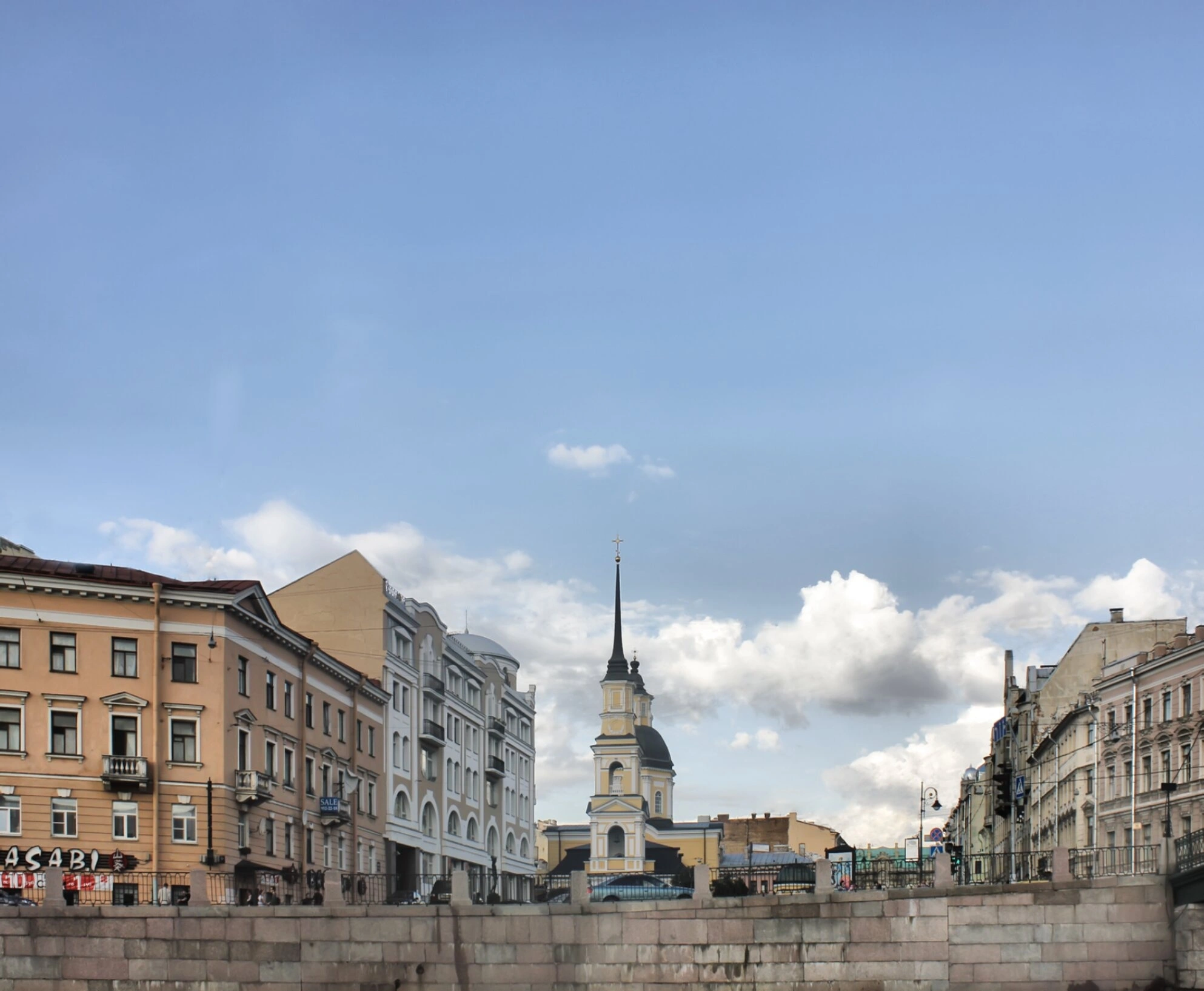 На фотографии хорошо видно расположение храма на гранитной набережной Фонтанки, с характерным парапетом на переднем плане. Окружающая застройка представляет собой классические петербургские здания, формирующие единый архитектурный ансамбль. В левой части кадра заметна современная вывеска, свидетельствующая о соседстве исторического памятника с объектами современной городской инфраструктуры.