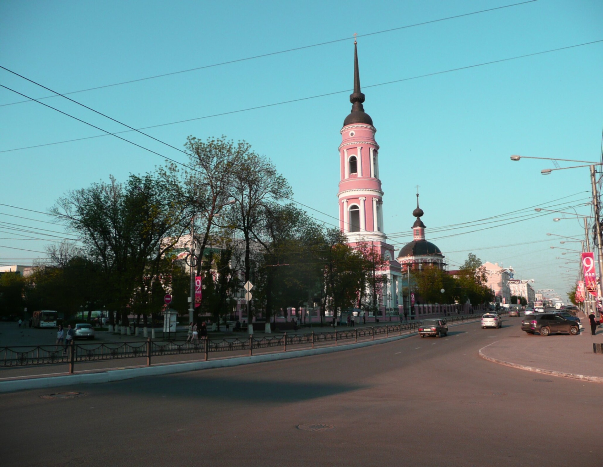 На представленной фотографии запечатлен храм в честь святых Жен-Мироносиц, расположенный в историческом центре города Калуги на улице Кирова. Этот православный храм является выдающимся памятником церковной архитектуры эпохи классицизма и объектом культурного наследия федерального значения.