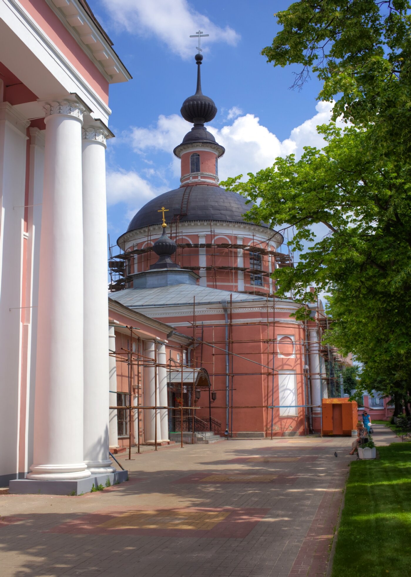 В момент съёмки храм частично окружён строительными лесами, что свидетельствует о проведении бережных реставрационных или ремонтных работ, направленных на сохранение этого духовного и культурного наследия для будущих поколений. На переднем плане фотографии виден ухоженный зелёный газон и дорожка, ведущая к святому месту. Справа от храма просматривается часть другого здания с белыми колоннами, а также кроны зелёных деревьев, обрамляющих небосклон.
