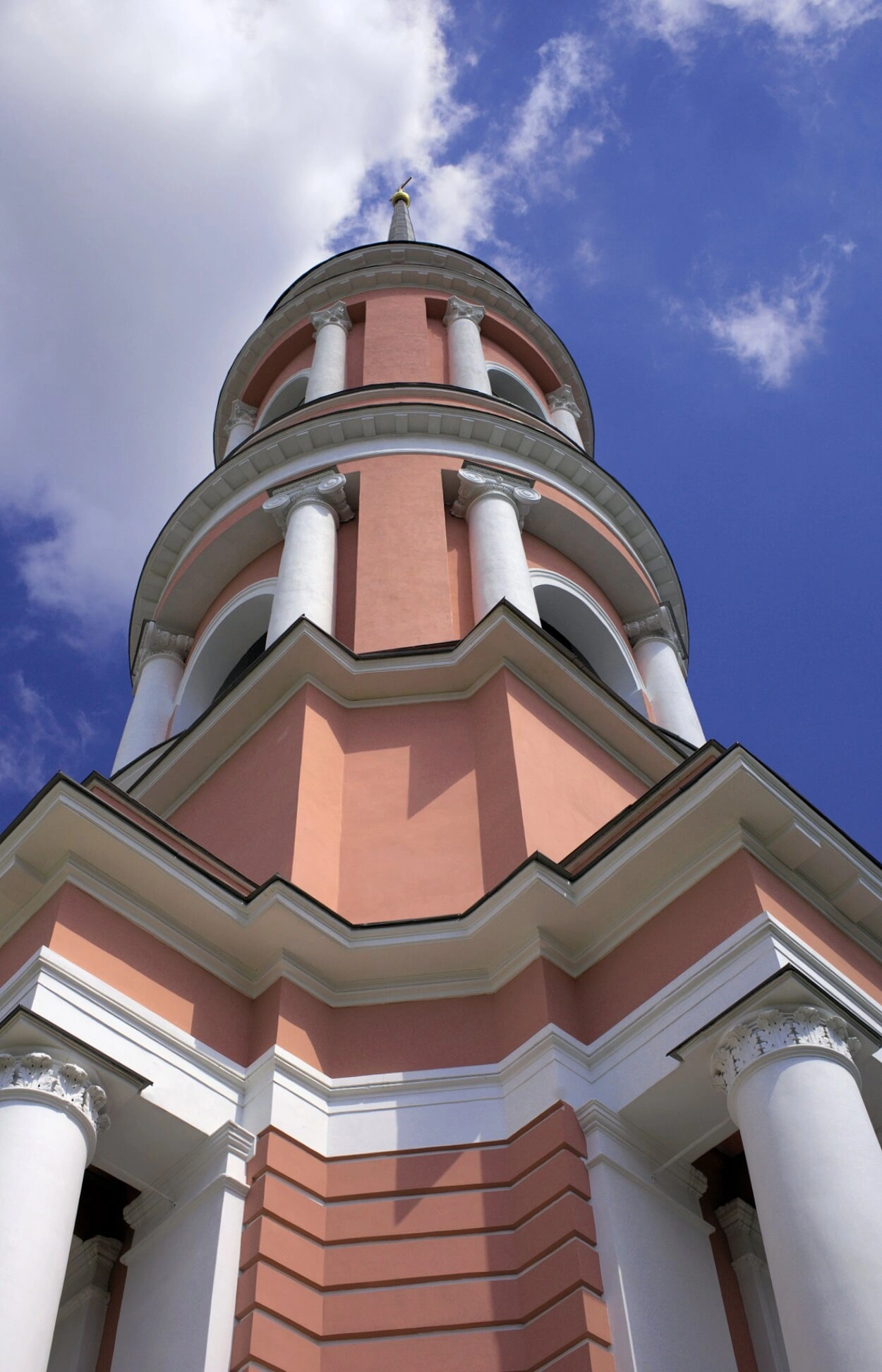 На представленной фотографии запечатлён величественный купол и верхняя часть колокольни православного храма в честь святых Жён-Мироносиц, что находится в городе Калуге. Здание церкви, выполненное в благородном стиле классицизма, обладает характерным розовым цветом фасада, который гармонично сочетается с белоснежными колоннами и декоративными элементами. Колонны поддерживают ярусы колокольни, устремляющейся ввысь, к небесам.