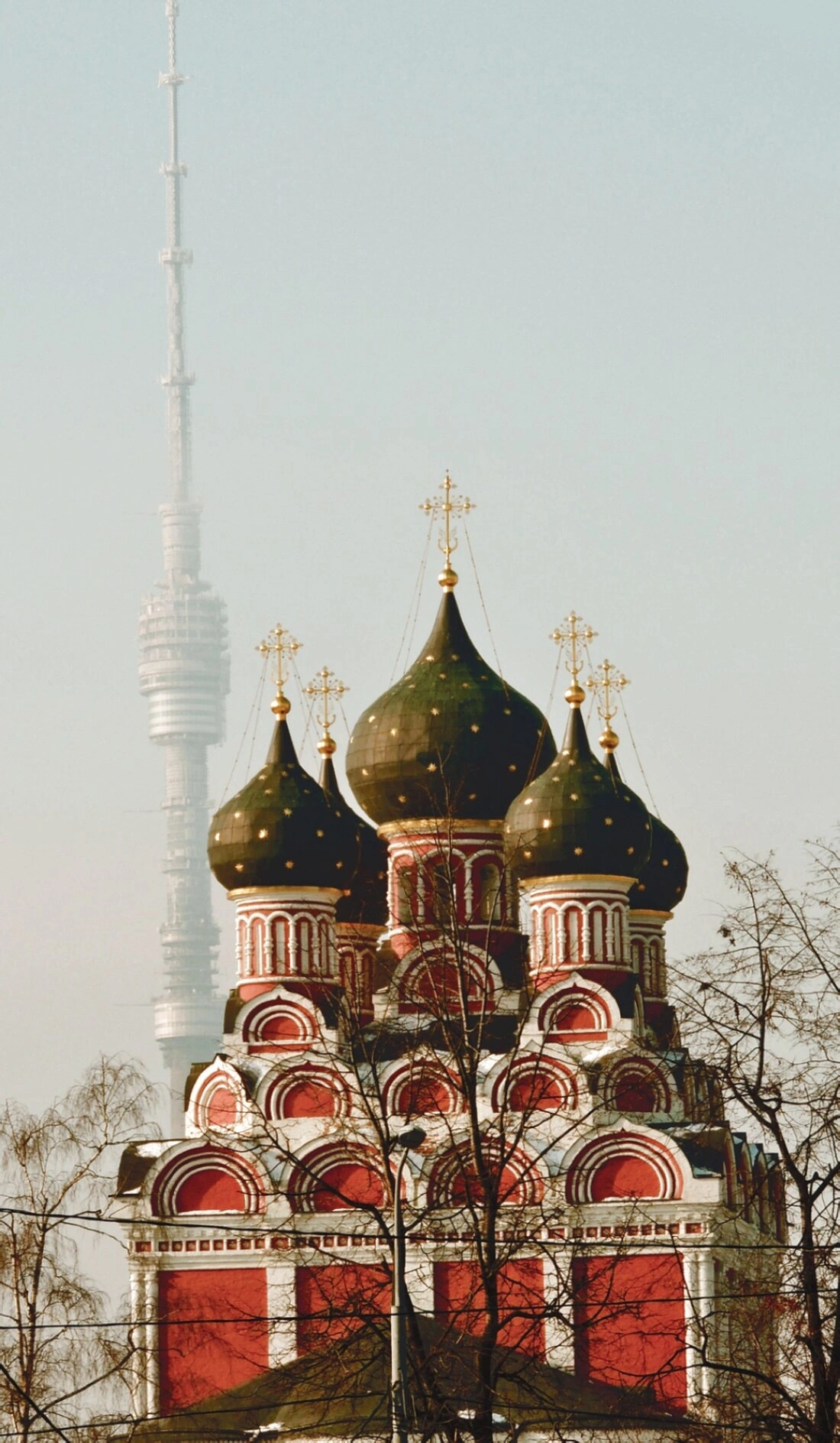 На заднем плане фотографии возвышается Останкинская телебашня, что создаёт уникальный визуальный контраст между древней православной святыней и современным инженерным сооружением. Такой ракурс подчёркивает историческую преемственность и духовную непрерывность русской культуры на протяжении веков.