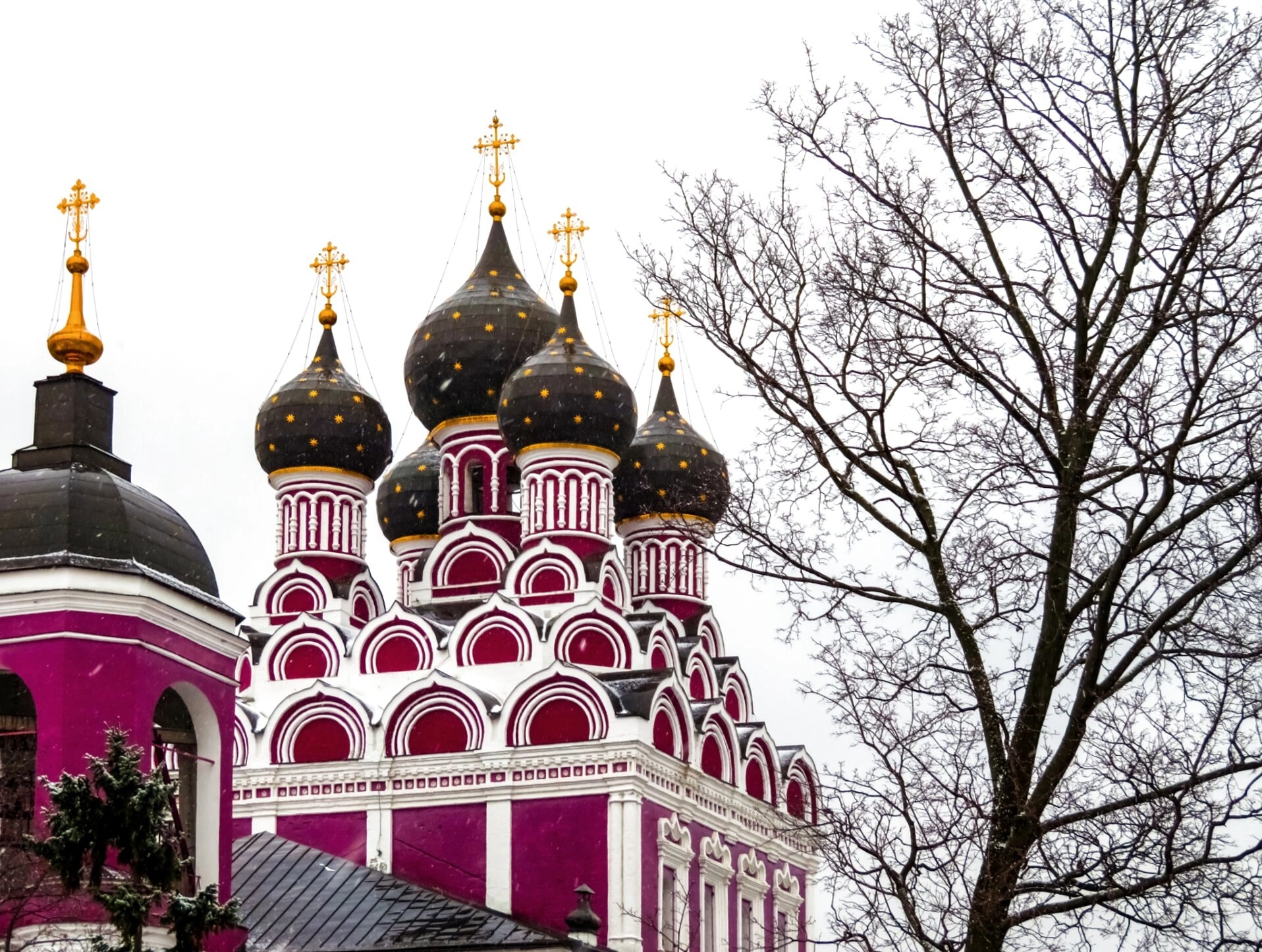 На представленной фотографии запечатлен храм Тихвинской иконы Божией Матери, расположенный в московском районе Алексеевское. Этот православный храм является выдающимся памятником русского церковного зодчества второй половины XVII века. Святыня была возведена в 1673-1682 годах при царе Алексее Михайловиче и освящена в честь чудотворного образа Пресвятой Богородицы.