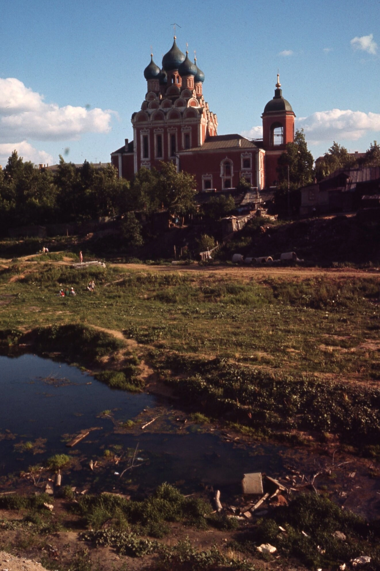Дом Божий возвышается на холме, что подчёркивает его духовную значимость и устремлённость к небу. Вокруг произрастают густые деревья и зелень, обрамляющие святыню живым, естественным покровом. У подножия холма виден пруд с естественными заросшими берегами, чьи воды, как зеркало, отражают небесную лазурь и благолепие храма. На среднем плане, среди травянистой местности, можно заметить фигуры нескольких человек, что добавляет снимку масштаба и жизни, но не являются крупным планом.