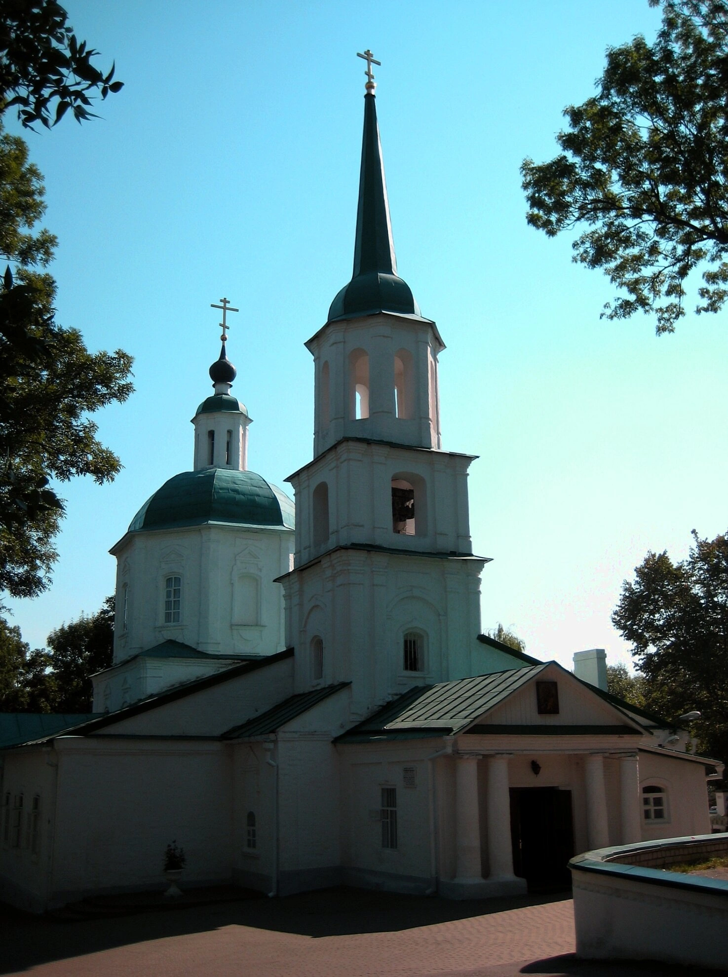 Святыня гармонично вписана в природный ландшафт: её окружают вековые деревья, а на заднем плане открывается безмятежное голубое небо. Лучи солнца мягко освещают фасад, играя на белых поверхностях и отбрасывая глубокие, выразительные тени, что придаёт снимку особую живость и духовную глубину. Этот храм является одним из значимых духовных центров Брянска и объектом культурного наследия.