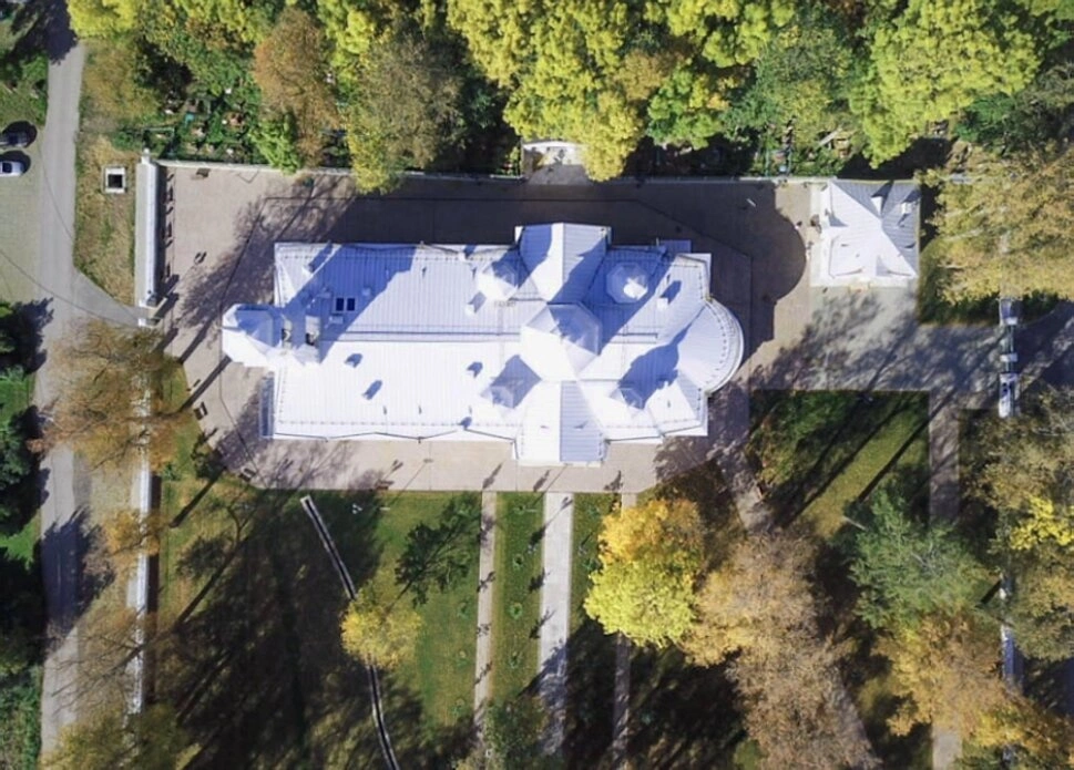На представленной фотографии запечатлён величественный храм в честь Тихвинской иконы Божией Матери, расположенный в деревне Путилово Кировского района Ленинградской области. Снимок выполнен с высоты, что позволяет в полной мере оценить монументальность церковного здания и его гармоничное единение с окружающим природным ландшафтом.