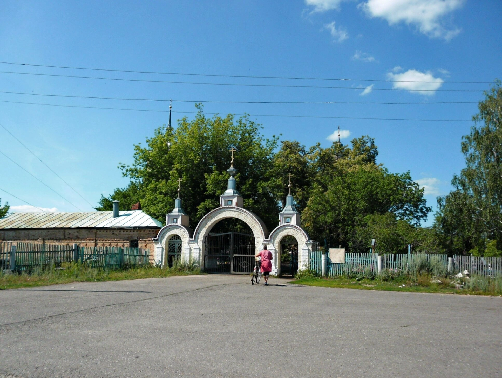 Каменная церковь была возведена в 1827 году на средства местного помещика, князя Николая Ивановича Гагарина. Храм строился для духовных нужд крестьян и стал архитектурной доминантой села. На снимке хорошо просматриваются монументальные Святые ворота, ведущие на огороженную церковную территорию, увенчанные небольшой главкой с крестом. За воротами виднеется главный объем храма с чешуйчатым куполом и крестом, а также часть церковных построек и окружающая их спокойная сельская растительность.
