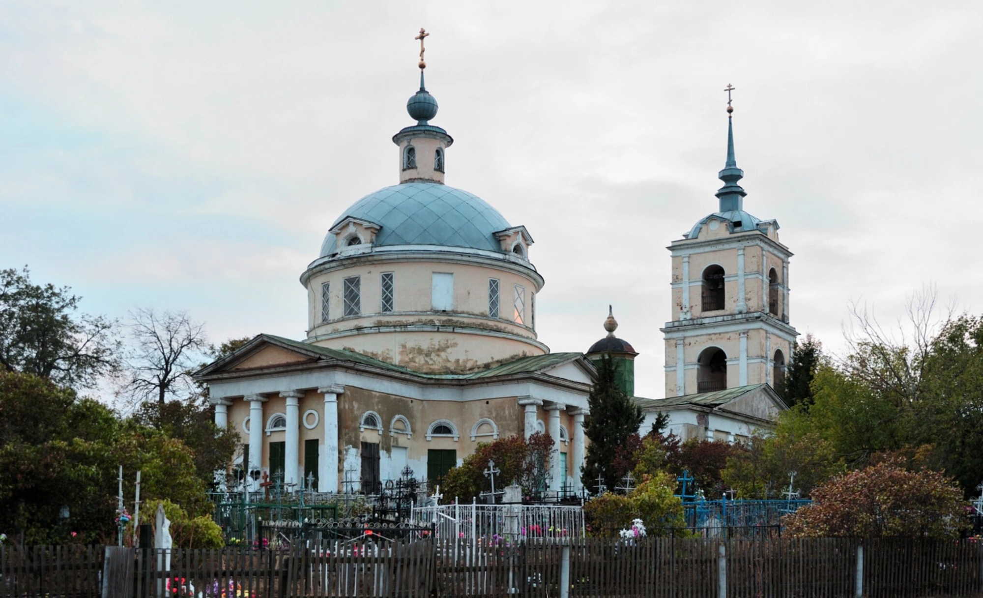 Территория вокруг храма благоустроена и ограждена деревянной оградой. Прилегающая земля, на которой виднеются намогильные кресты, является старинным церковным кладбищем, что свидетельствует о многолетней истории этого святого места. Храм представляет собой ценный памятник культурного наследия и является неотъемлемой частью историко-архитектурного ландшафта Подмосковья, продолжая оставаться действующим духовным центром для православных верующих.