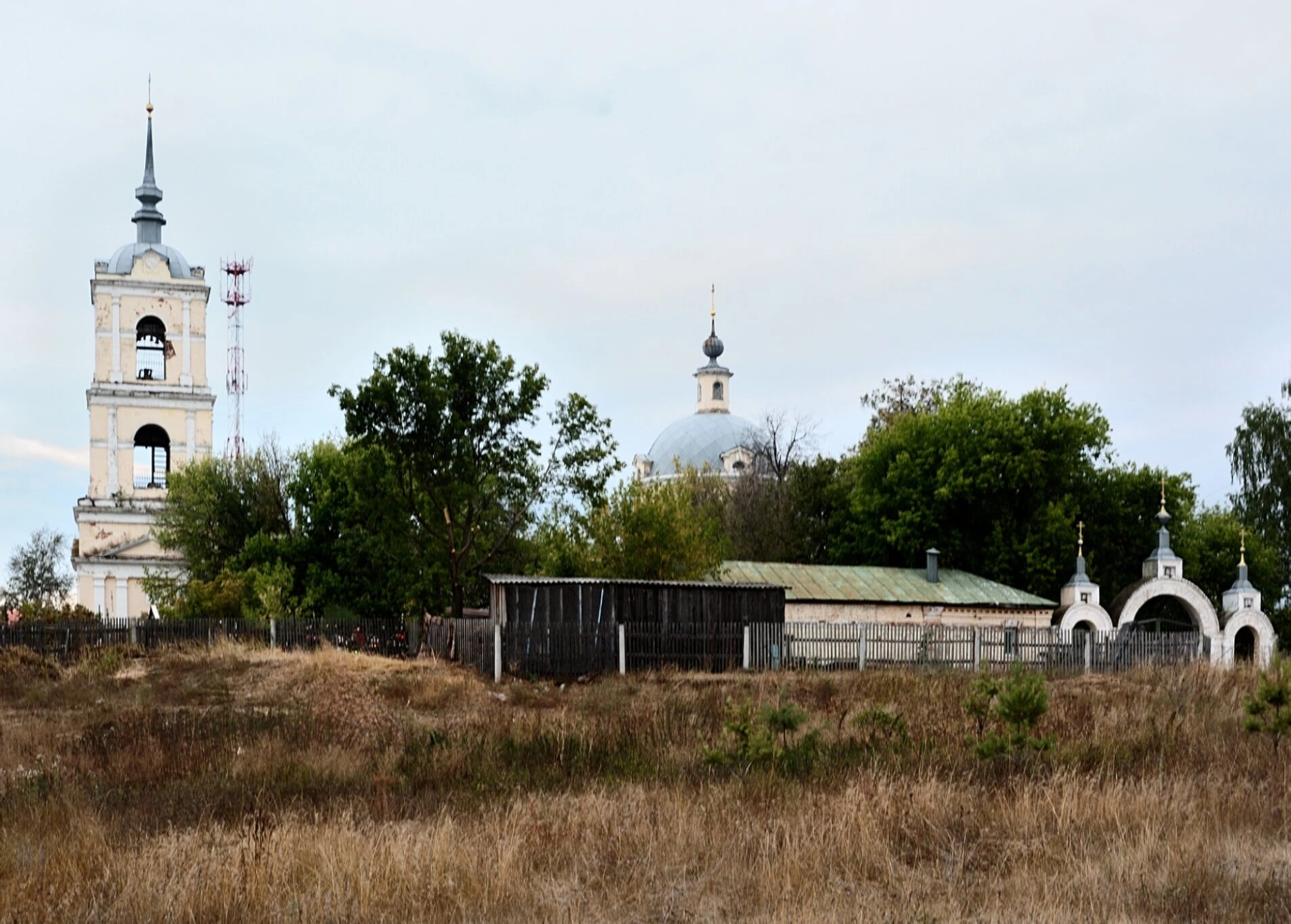 Территория вокруг храма благоустроена и ограждена деревянной оградой, что обозначает священную ограду — особое, освящённое пространство, отделённое от мирской суеты. Прихрамовая площадь окружена деревьями и кустарниками, а на переднем плане видна характерная для средней полосы России растительность. Церковь Трёх Святителей освящена в честь великих вселенских учителей и святителей — Василия Великого, Григория Богослова и Иоанна Златоуста, что делает её важным духовным центром для жителей всего региона.
