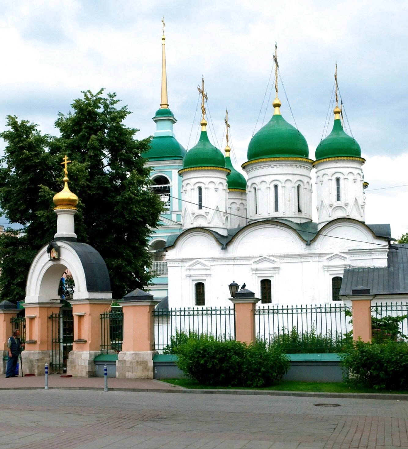 Фотография позволяет рассмотреть не только красоту самого храма, но и его гармоничное вписывание в городской ландшафт. Святыня обнесена ажурной оградой, установленной на невысоком каменном цоколе. На переднем плане снимка виднеется часть городской улицы с припаркованными автомобилями, а над ней протянулись линии электропередач. На заднем плане, за кронами деревьев, просматриваются фасады других столичных зданий, что подчёркивает расположение храма в самом сердце исторической Москвы. Отсутствие на фотографии людей, особенно крупным планом, позволяет зрителю полностью сосредоточить внимание на созерцании благодатной архитектуры и духовной значимости этого места, которое на протяжении веков является центром молитвы и православного благочестия.