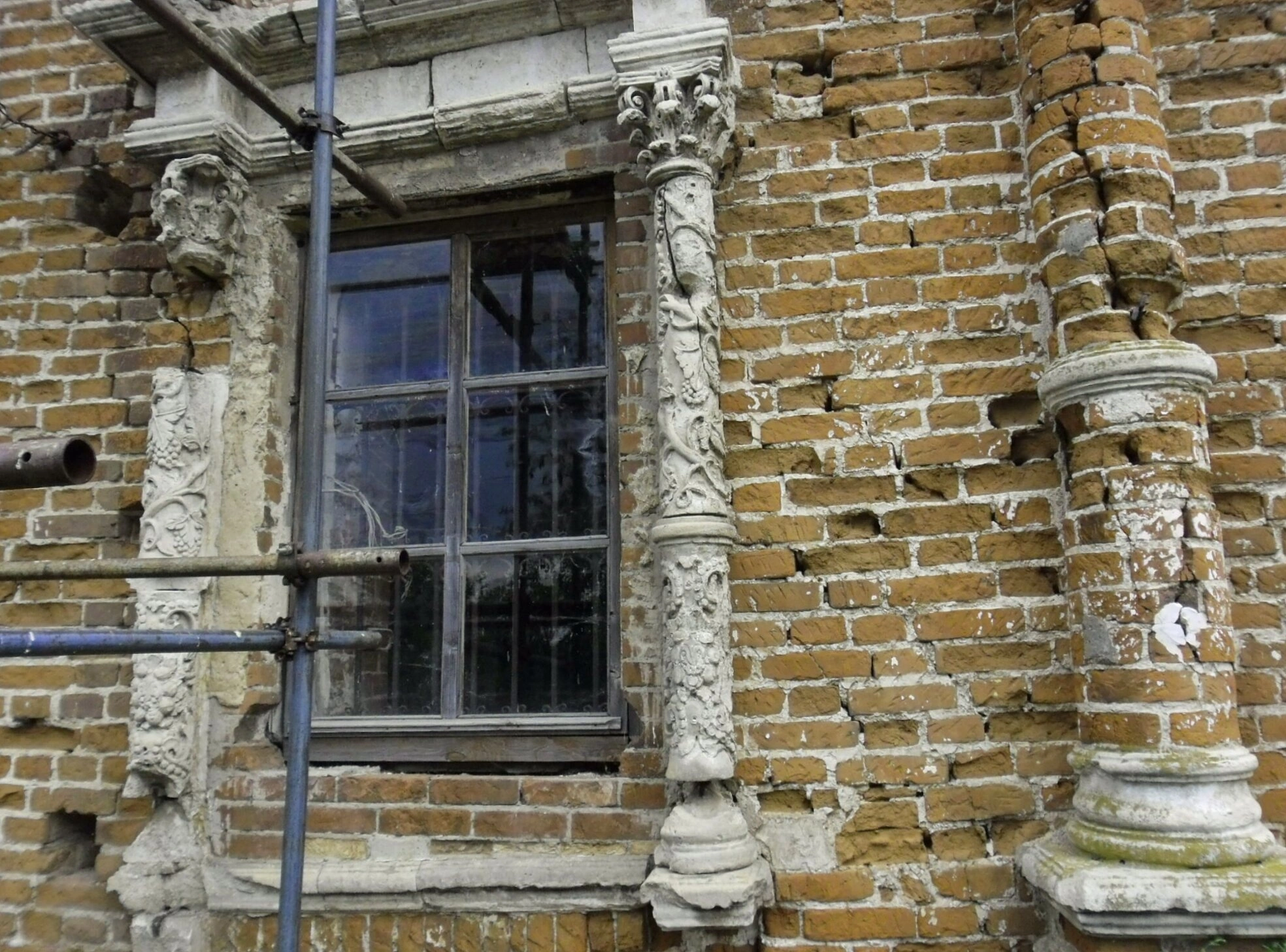 На представленной фотографии запечатлён фрагмент стены Храма Троицы Живоначальной в старинном селе Дединово. Изображение демонстрирует уникальный образец древнерусского церковного зодчества, а именно богато украшенный белокаменный наличник, обрамляющий оконный проём. Искусная резьба по камню, сохранившаяся несмотря на видимые следы времени, включает в себя декоративные колонны с капителями и сложные орнаментальные композиции, характерные для конца XVII века.