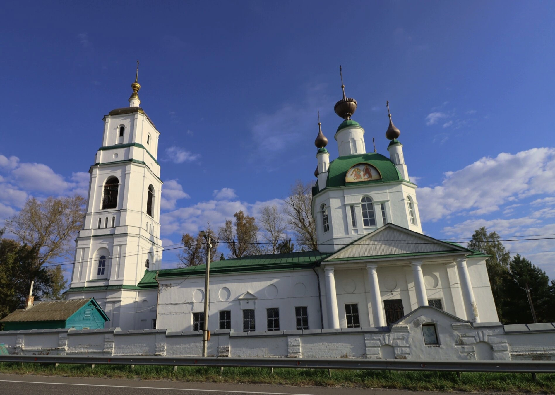 Храм представляет собой каменное сооружение, выстроенное в традициях русского церковного зодчества. Его архитектурный облик отличается строгостью форм и благолепием, характерным для православных церквей. На снимке хорошо видны основные элементы храма: четверик, увенчанный луковичной главкой, установленной на изящном барабане, а также шатровая колокольня, являющаяся неотъемлемой частью ансамбля.