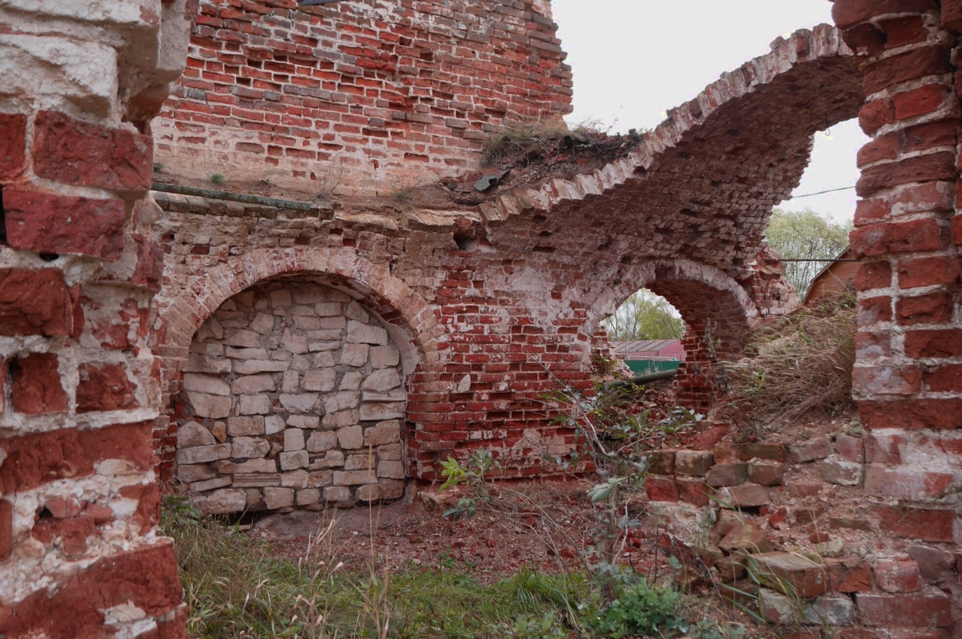 На фотографии запечатлён Троицкий храм в селе Лужники Ступинского района Московской области, находящийся в состоянии благодатного восстановления после долгих лет запустения. Этот православный храм, освящённый во имя Живоначальной Троицы, представляет собой кирпичную однокупольную церковь, выполненную в стиле ампир с трапезной и колокольней.