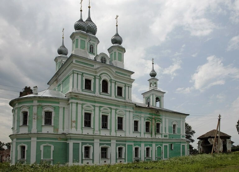На представленной фотографии запечатлён храм Троицы Живоначальной, расположенный в старинном селе Вощажниково Борисоглебского района Ярославской области. Этот каменный пятиглавый храм с колокольней является ярким памятником ярославской архитектурной школы и объектом культурного наследия.