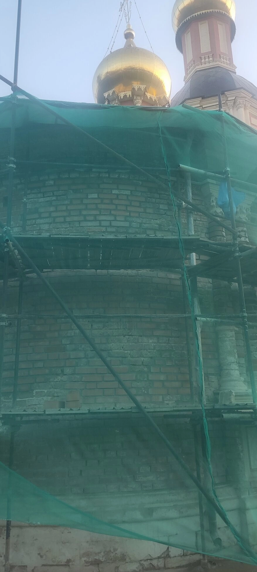 Фасад храма, выполненный из светлого кирпича, частично скрыт под строительными лесами, обтянутыми зелёной защитной сеткой. Это свидетельствует о внимательном отношении к сохранению архитектурного наследия и проведении масштабных работ по восстановлению святыни. Над всем сооружением возвышаются два златоверхих купола, сияющих под лучами солнца.