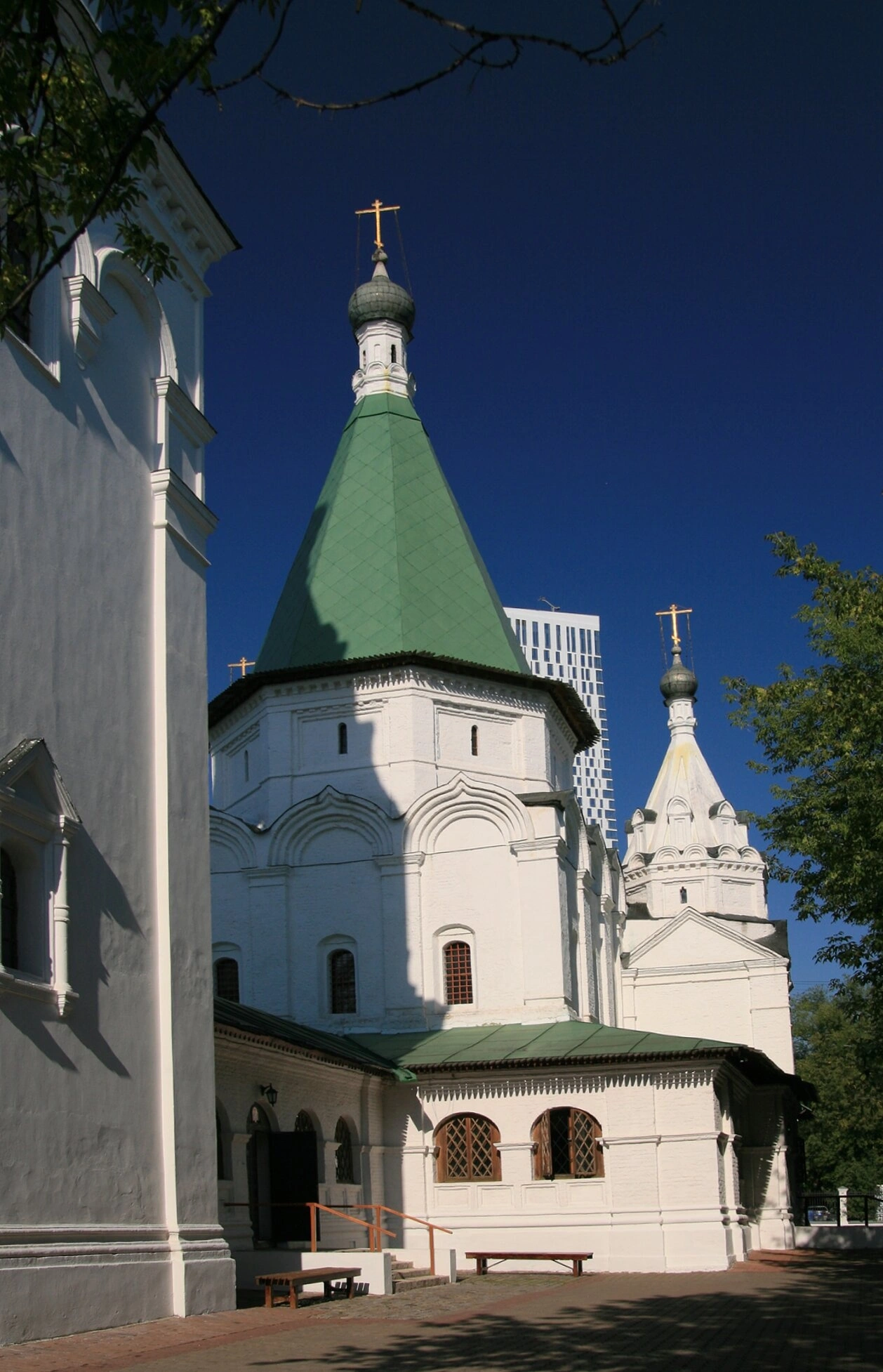 В нижней части здания просматривается крытая галерея с арочными проемами, ведущая к главному входу в храм. Святыня окружена ухоженной территорией с зелеными насаждениями, создающими гармоничный природный фон. На заднем плане фотографии виден современный городской пейзаж, что подчеркивает историческую ценность храма как духовного центра, сохранившего свое значение в условиях мегаполиса.