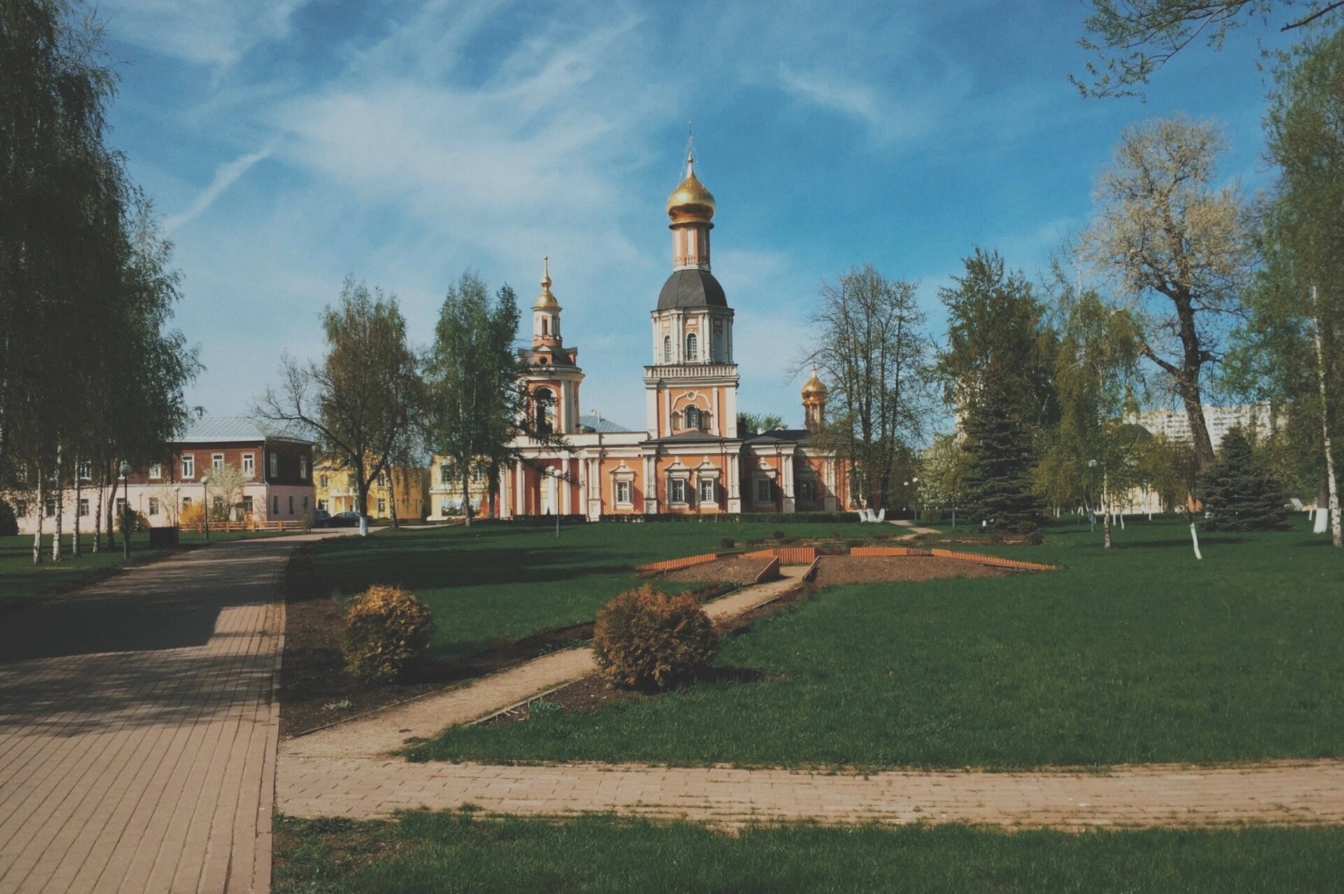 Высокая колокольня с золоченым завершением dominates над архитектурным ансамблем, придавая всей композиции стройность и устремленность ввысь. В декоре верхних ярусов и колокольни прослеживаются изящные барочные элементы, включая парапеты с фигурными балясинами, что характерно для архитектуры первой половины XVIII века.