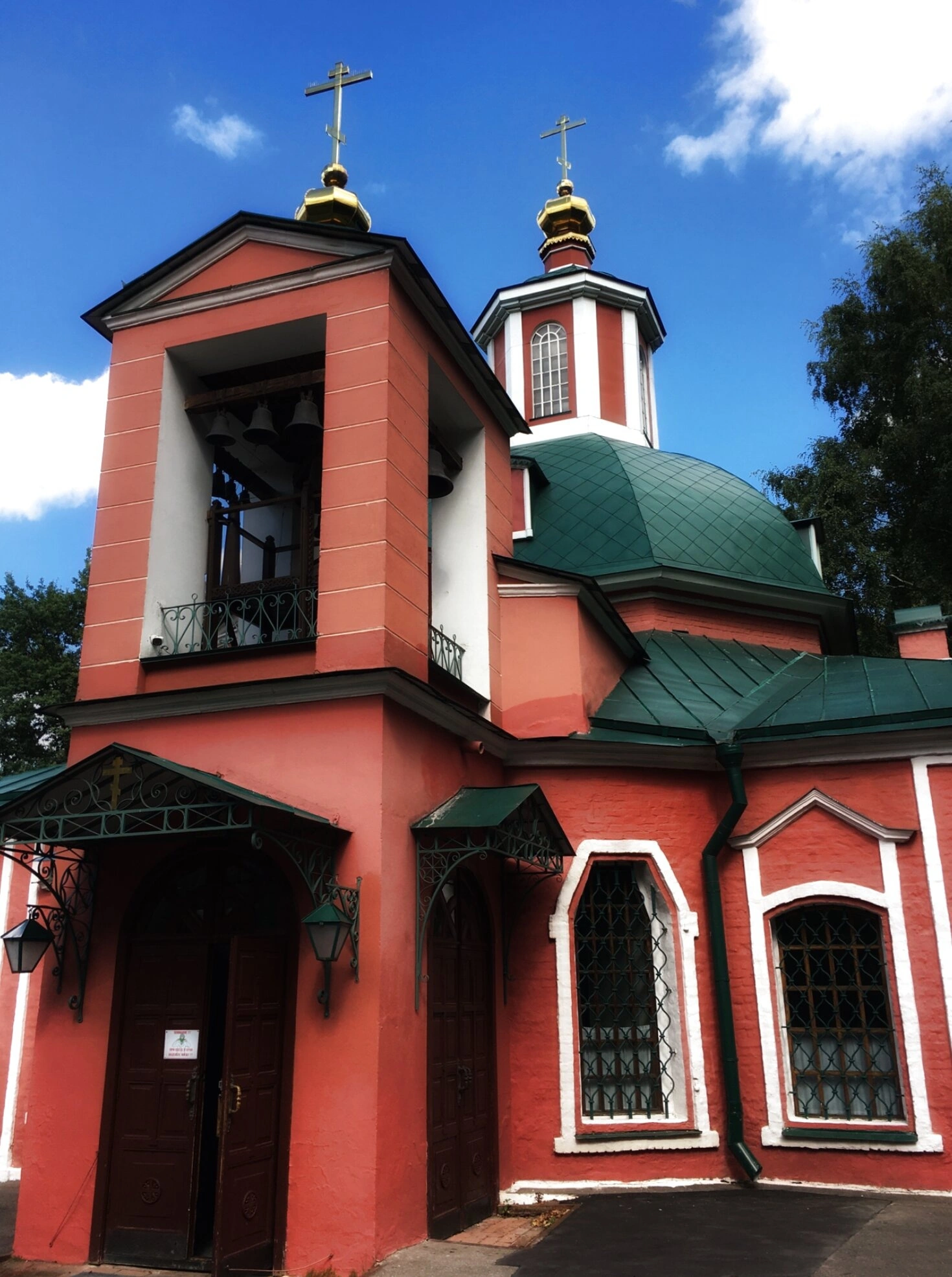 На снимке храм показан с северной стороны. Ярко-красные стены и тёмно-зелёные кровли создают благородное цветовое сочетание. Слева возвышается восстановленная колокольня с арочными проёмами для колоколов. Завершает композицию голубое небо и обрамляющая храм зелень Воронцовского парка, подчёркивая гармонию творения рук человеческих и Божьего мира.