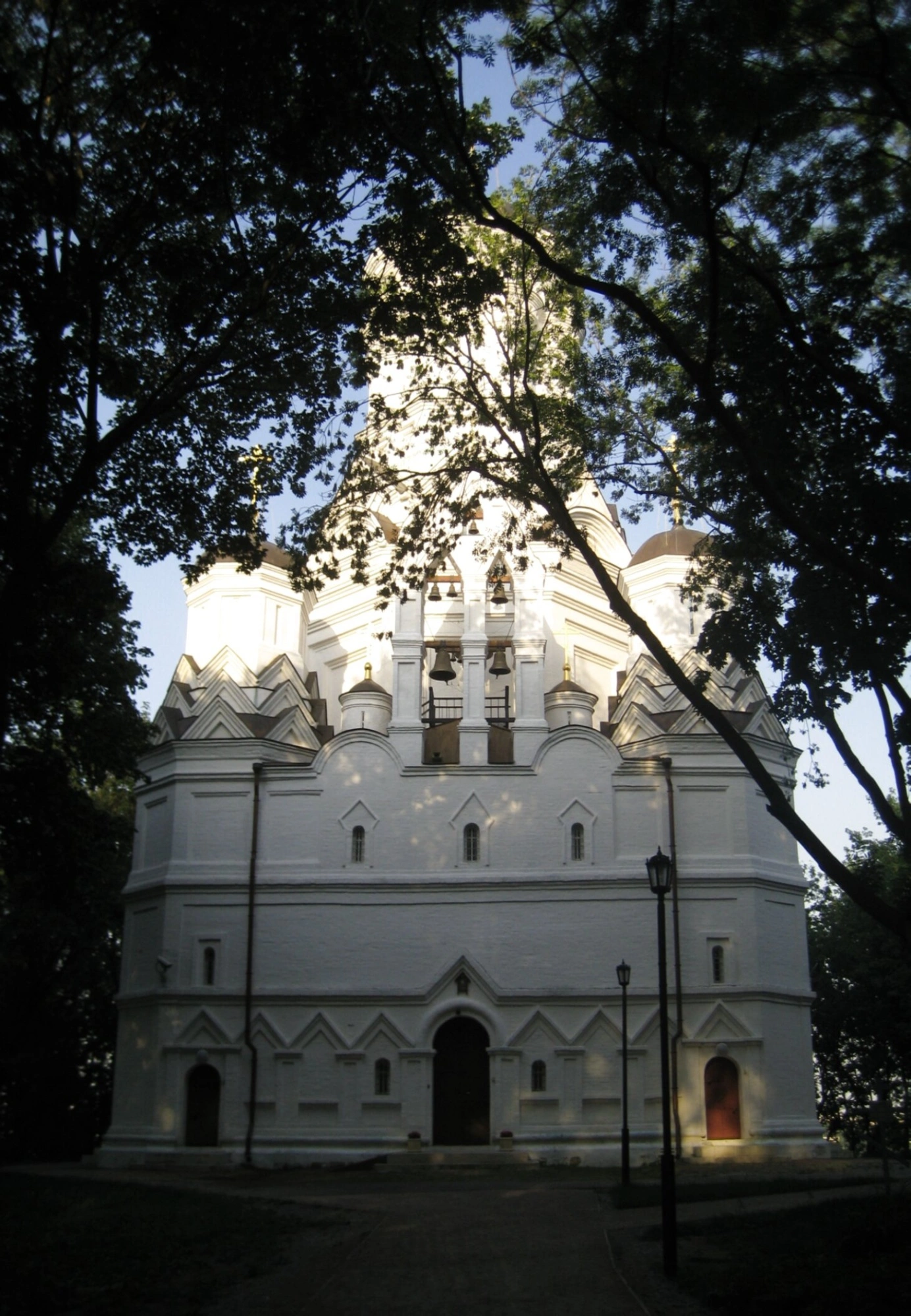 На фотографии запечатлён храм Усекновения Главы Иоанна Предтечи в Дьякове — выдающийся памятник русского церковного зодчества, расположенный на территории музея-заповедника «Коломенское». Этот действующий православный храм является единственным, помимо собора Покрова на Рву, сохранившимся многостолпным храмом XVI века. Святыня возвышается на правом берегу Москвы-реки, где в XVI столетии находилась царская резиденция.
