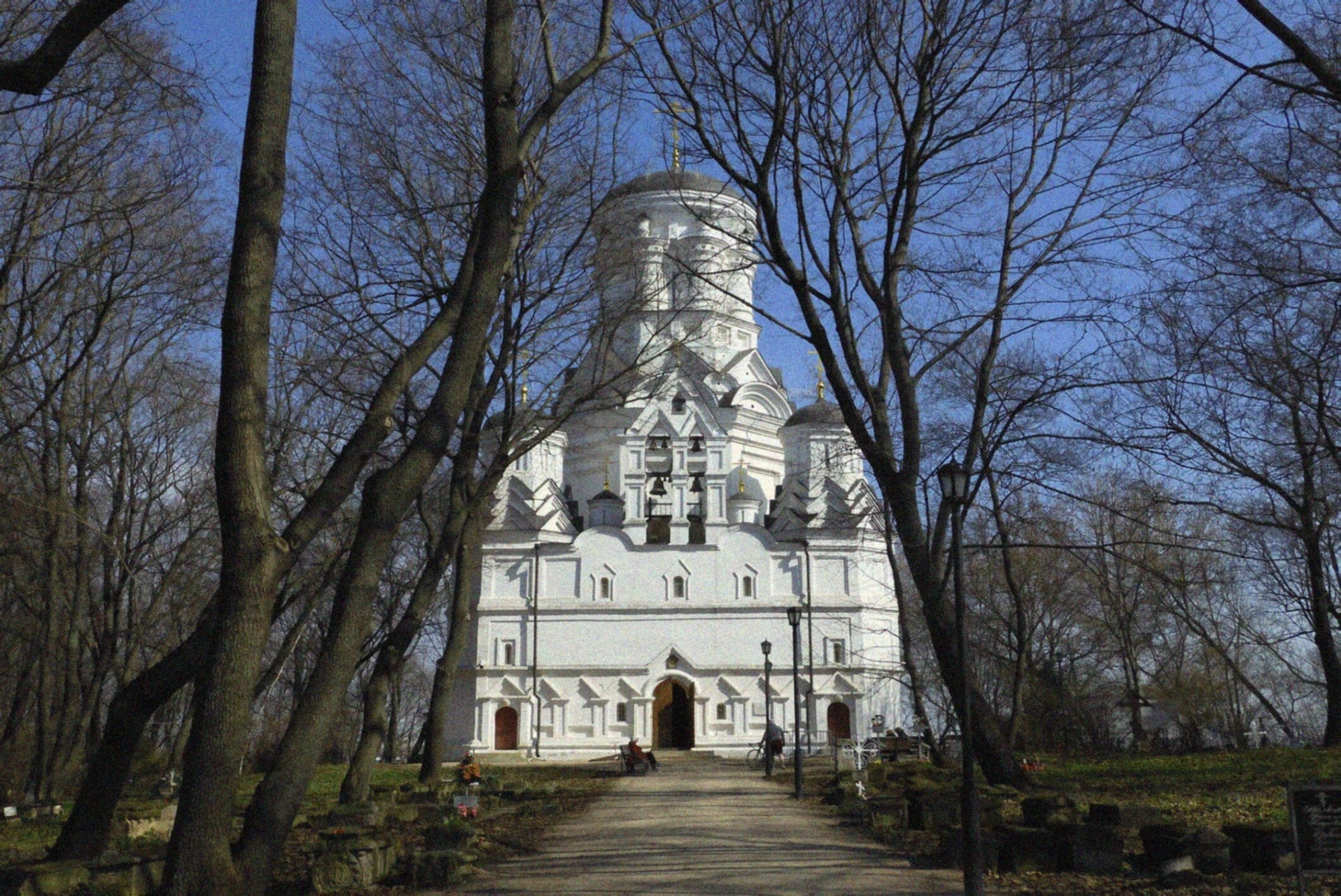 На снимке храм предстаёт в окружении оголённых деревьев, что позволяет предположить, что фотография сделана в предзимний или ранневесенний период. К святым вратам ведёт дорожка, по которой движутся богомольцы и посетители. Вблизи церковных стен виднеются древние надгробия, свидетельствующие о существовавшем здесь ранее кладбище, что придаёт месту особую историческую и мемориальную значимость.