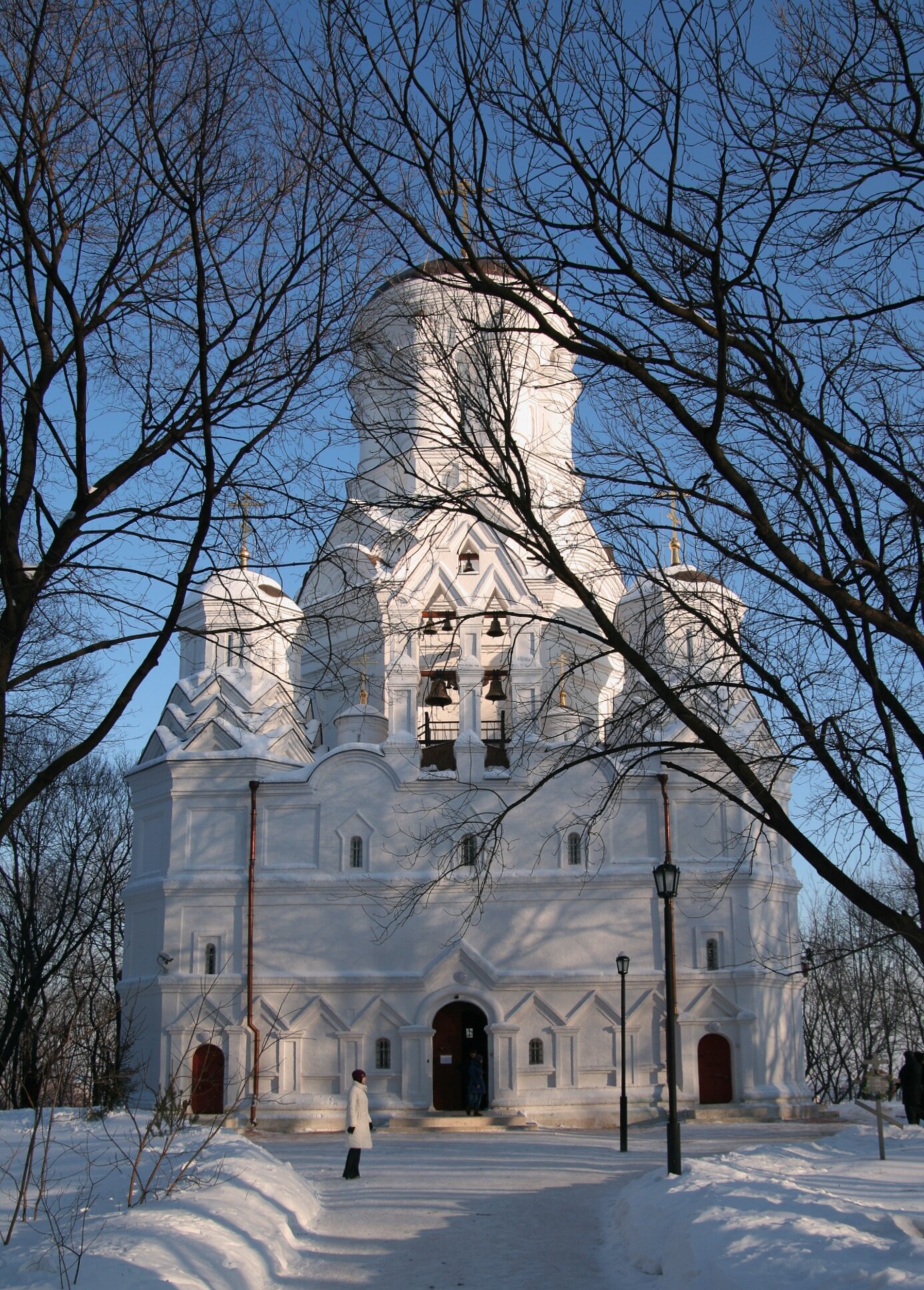 Белоснежный храм, снятый в зимнюю пору, предстаёт во всей своей монументальной красоте и строгом величии. Его архитектурный облик, выполненный в традициях шатрового зодчества, уникален. Центральный объём состоит из пяти восьмигранных столпов, объединённых в единую композицию и увенчанных мощным световым барабаном с главкой. Вокруг центрального столпа симметрично расположены четыре придела, также завершённые шатрами, что создаёт сложный и живописный силуэт, устремлённый в небо.
