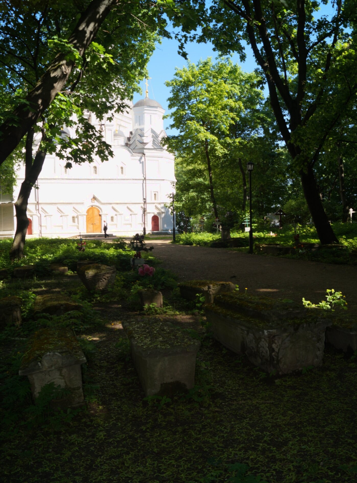 На среднем плане, в обрамлении тенистой зелени, чётко читаются элементы благоустройства — уличные фонари, гармонично вписанные в ландшафт. Они подчёркивают ухоженность этого святого места, предназначенного для молитвенного покоя и памяти.