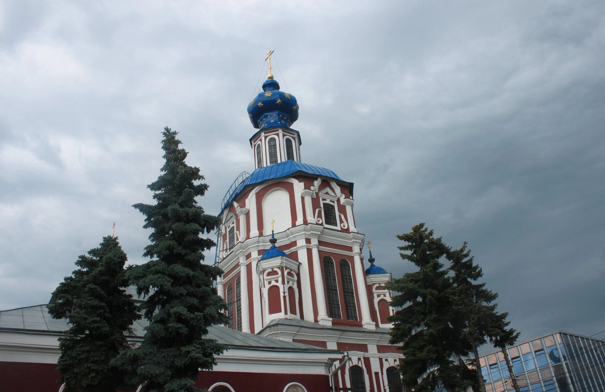 На фотографии запечатлён старинный православный храм в честь Усекновения Честной Главы Святого Иоанна Предтечи, расположенный в исторической части города Калуги. Это один из древнейших каменных храмов города, обладающий особой духовной и исторической ценностью.