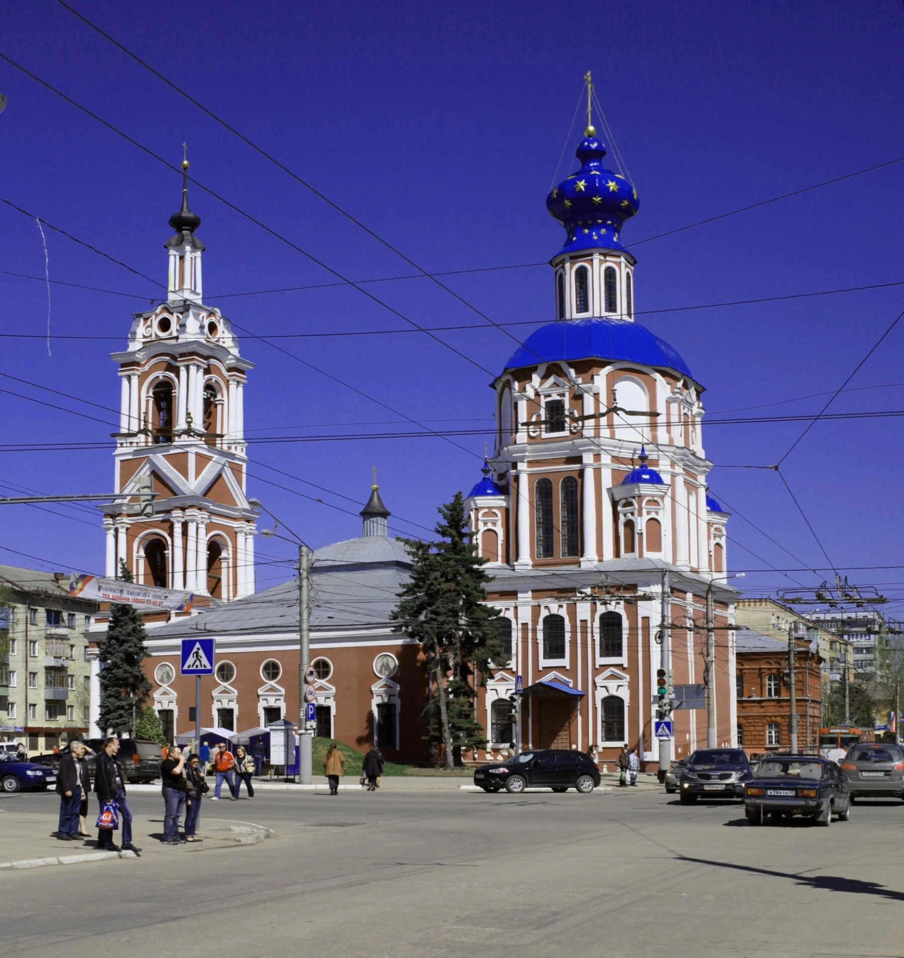 На представленной фотографии запечатлён величественный храм в честь Усекновения Честныя Главы Святого славного Пророка, Предтечи и Крестителя Господня Иоанна, расположенный в историческом центре города Калуги на улице Кирова. Этот православный храм является выдающимся памятником церковной архитектуры и одной из духовных доминант города.