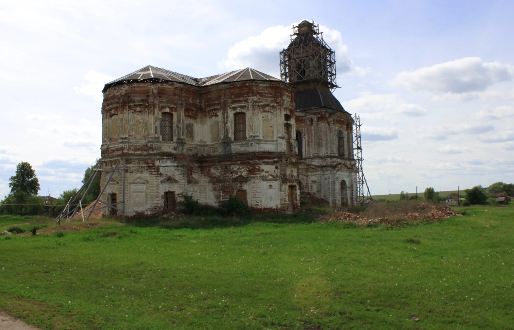 Здание церкви, возведённое в стиле барокко во второй половине XVIII века, представляет собой двухэтажную каменную постройку с высокой колокольней. На момент съёмки храм находится в состоянии активной реставрации, о чём красноречиво свидетельствуют установленные строительные леса, окружающие ярусы колокольни. Это вселяет надежду на скорое возрождение святыни.