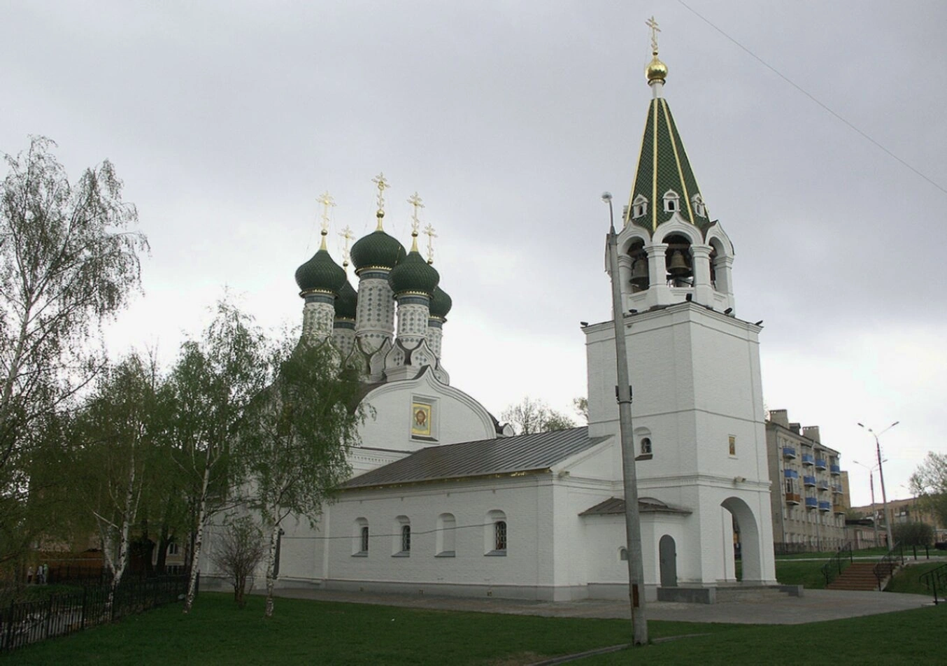 На снимке видно, что территория вокруг церкви благоустроена: ухоженный зелёный газон и берёзы создают атмосферу благолепия и умиротворения, контрастируя с современными жилыми зданиями, виднеющимися на заднем плане. Фотография передаёт не только архитектурную красоту, но и духовную значимость этого места, являющегося неотъемлемой частью историко-культурного ландшафта Нижнего Новгорода.