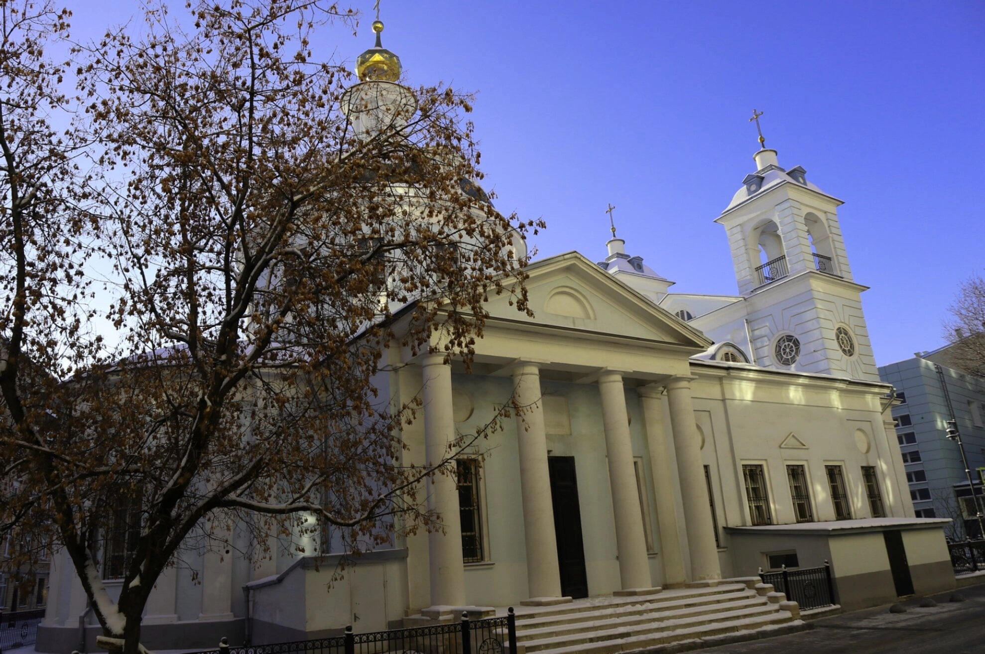 На представленной фотографии запечатлён Храм Успения Пресвятой Богородицы на Могильцах — православный храм в центре Москвы. Снимок сделан в зимний период: на земле и ветвях деревьев лежит снег, небо ясное, морозное. Солнечный свет мягко освещает белоснежные стены здания, подчёркивая изящество архитектурных форм.