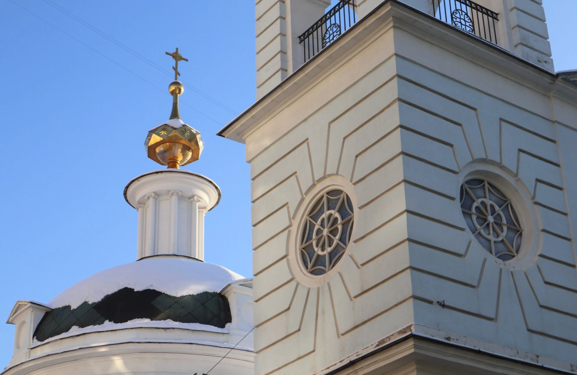 В левой части изображения видна часть белого купола, укрытого снегом. На его вершине возвышается позолоченный барабан с луковичной главкой, увенчанной православным крестом. Этот завершающий элемент символизирует победу жизни над смертью и напоминает о празднике Успения Пресвятой Богородицы, в честь которого освящён престол.