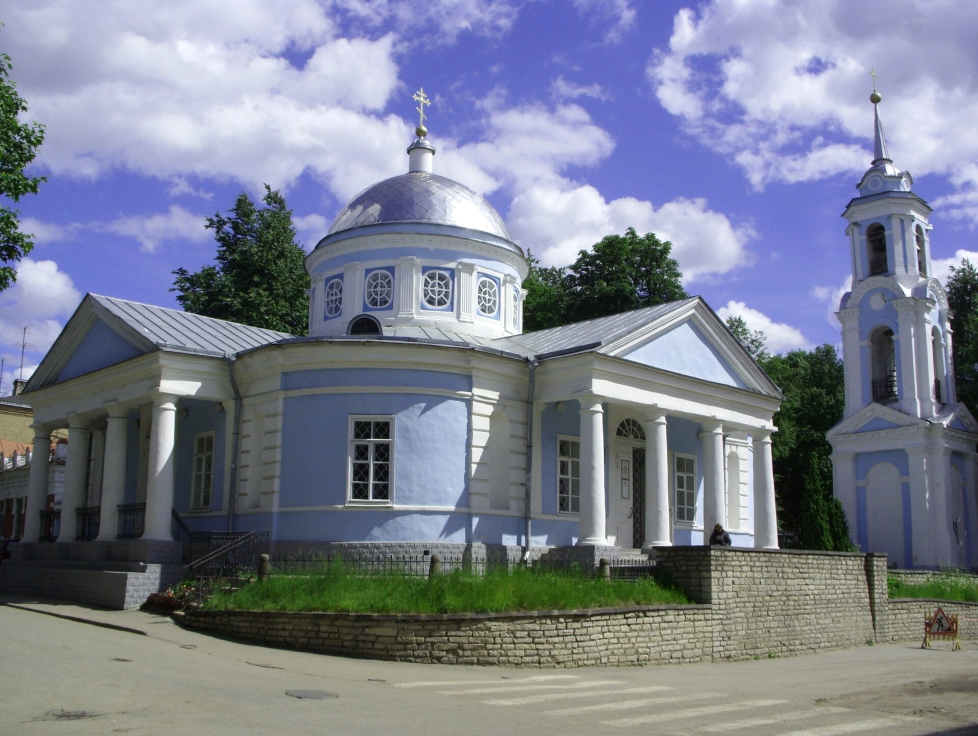 На представленной фотографии запечатлён величественный вид Церкви Успения Пресвятой Богородицы, что на Полонище, в древнем граде Пскове. Храм, освящённый в честь Успения Божией Матери, является выдающимся образцом православной архитектуры эпохи классицизма. Его лазурный фасад, украшенный белоснежными колоннами и пилястрами, создаёт ощущение небесной лёгкости и благодати. Серебряный купол, увенчанный православным крестом, и стройная колокольня устремлены ввысь, символизируя молитвенное горение к Господу.