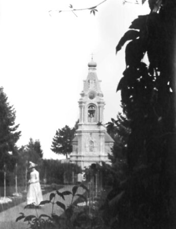 Основным композиционным центром снимка становится стройная многоярусная колокольня, выполненная в традициях русского классицизма. Её белоснежные стены и изящные архитектурные формы эффектно выделяются на фоне густой зелени окружающего парка. Колокольня увенчана золотой главкой с воздвигнутым на неё православным крестом, сияющим под небесным светом.