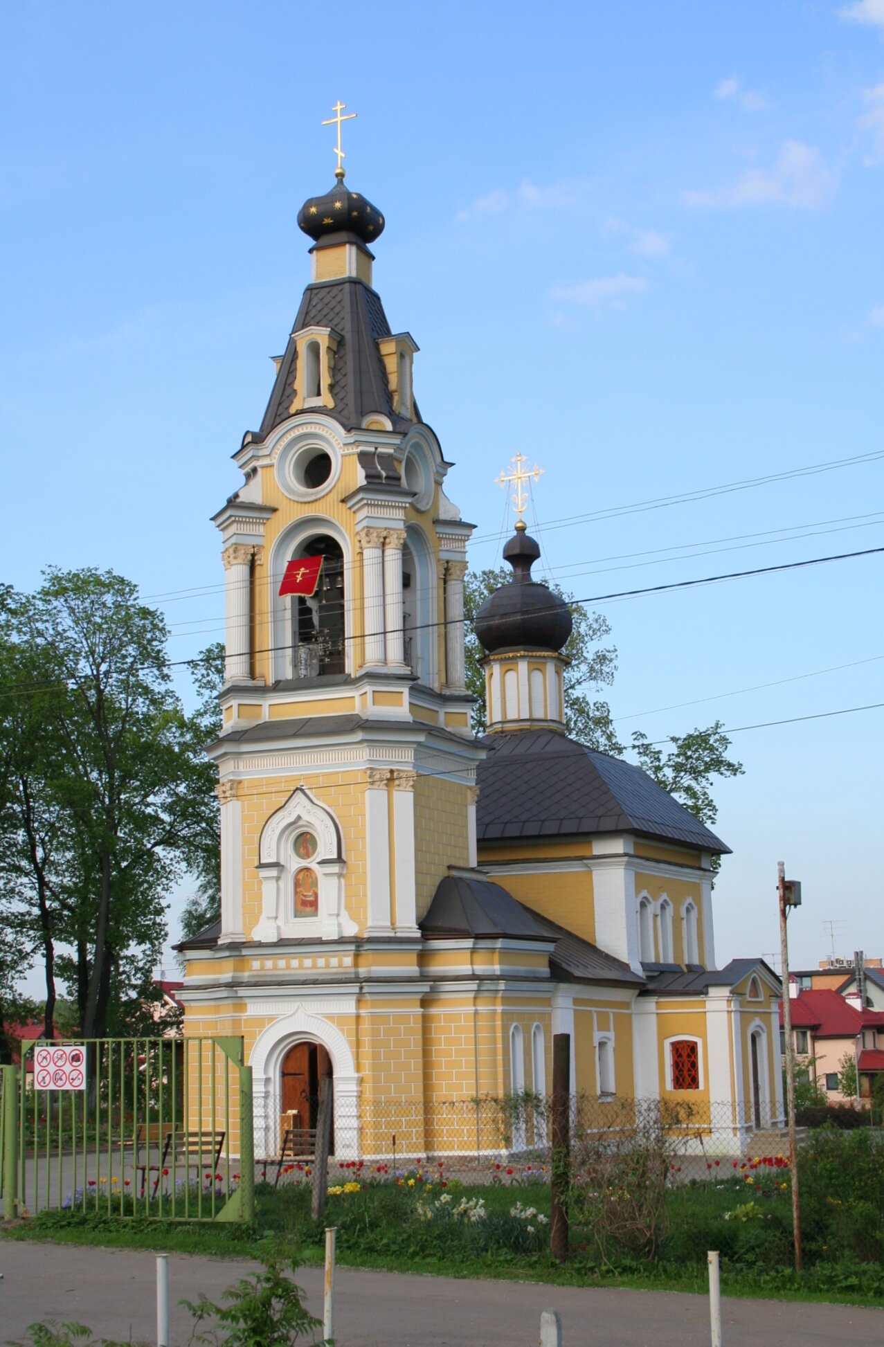 Территория вокруг храма благоустроена и ухожена, о чём свидетельствует аккуратный металлический забор, отделяющий священное пространство от мирской суеты. Храм утопает в зелени деревьев, что подчёркивает его гармоничную связь с природой и создаёт ощущение покоя и умиротворения. Фотография сделана в ясный солнечный день, благодаря чему свет мягко ложится на стены, подчёркивая изящество архитектурных линий и богатство декора.