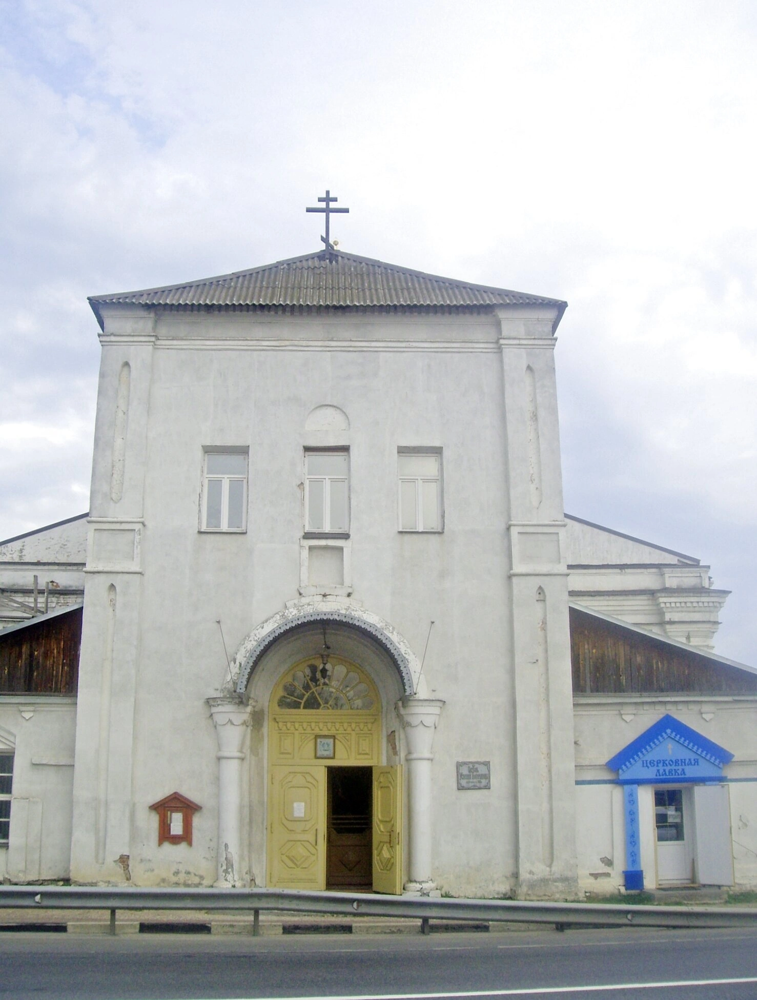 Справа от входа располагается церковная лавка, где паломники и прихожане могут приобрести свечи, православную литературу, иконы и другую духовную продукцию. На переднем плане видно дорожное ограждение, обозначающее благоустроенную территорию вокруг святого места. На заднем плане открывается вид на облачное небо, создающее торжественный и светлый фон для домостроительства Божия.