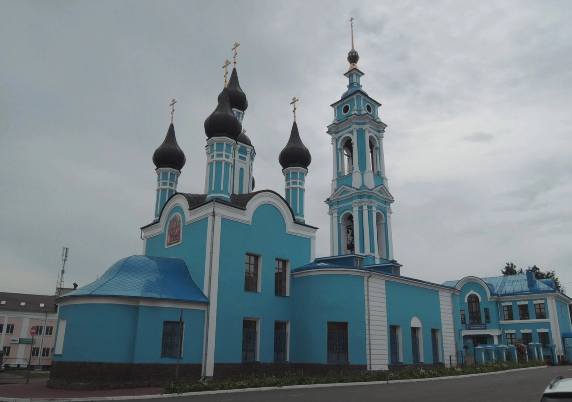 На фотографии запечатлён храм в честь Успения Пресвятой Богородицы, находящийся в историческом центре города Калуги на улице Достоевского. Этот каменный православный храм, узнаваемый по своему яркому лазурному цвету стен и золочёным куполам, был возведён в 1685 году на месте более древней деревянной церкви и является выдающимся памятником русского церковного зодчества XVII столетия.