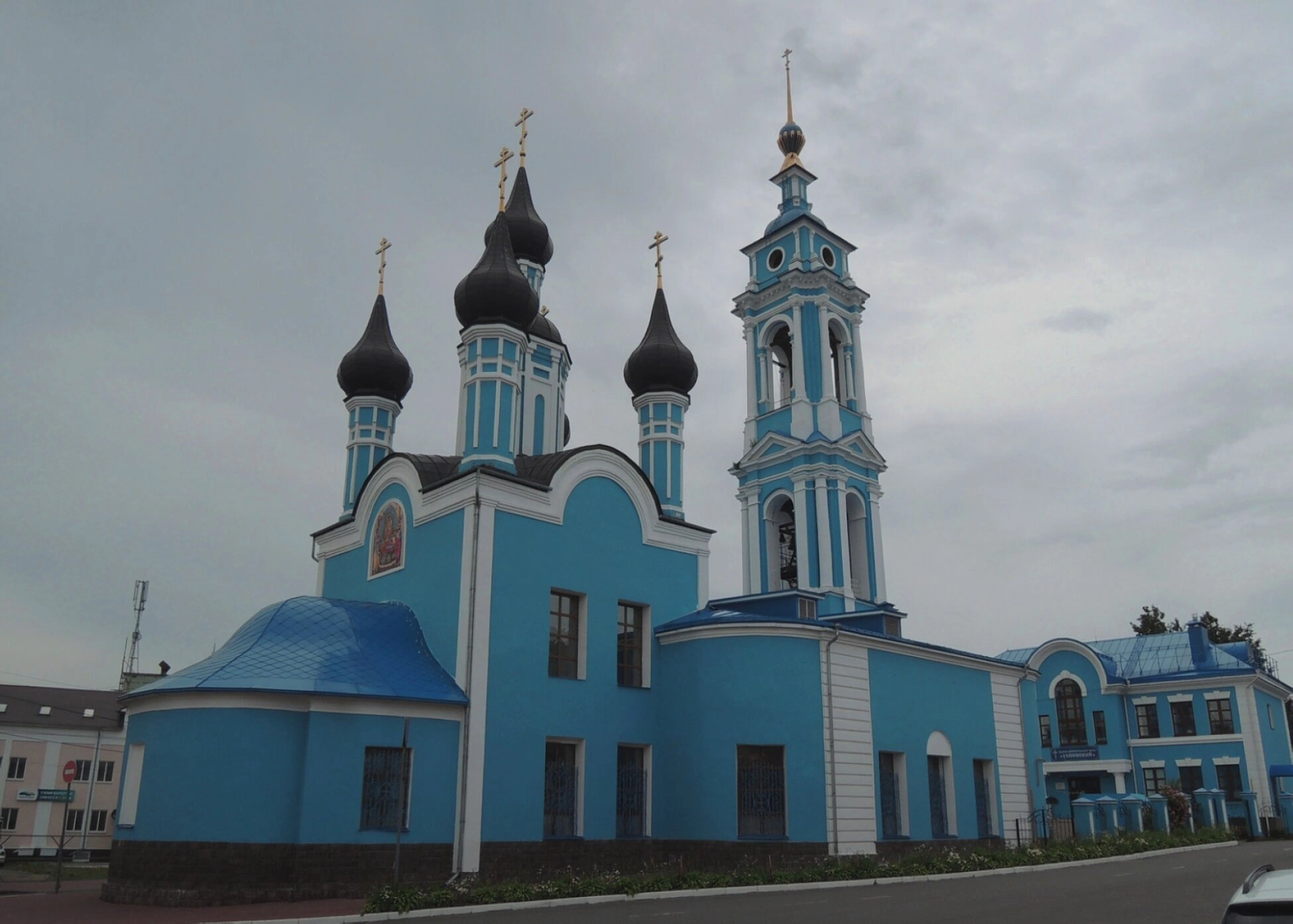 Святыня представляет собой гармоничный ансамбль, состоящий из основного объёма и высокой многоярусной колокольни. Здание храма окрашено в небесно-голубой цвет, который символизирует чистоту и небесную благодать, а декоративные элементы и колонны выбелены, создавая торжественное и лёгкое сочетание. Чёрные купола, увенчанные златоглавыми крестами, устремляются ввысь, являя собой образ молитвенного горения и связи земного с небесным.