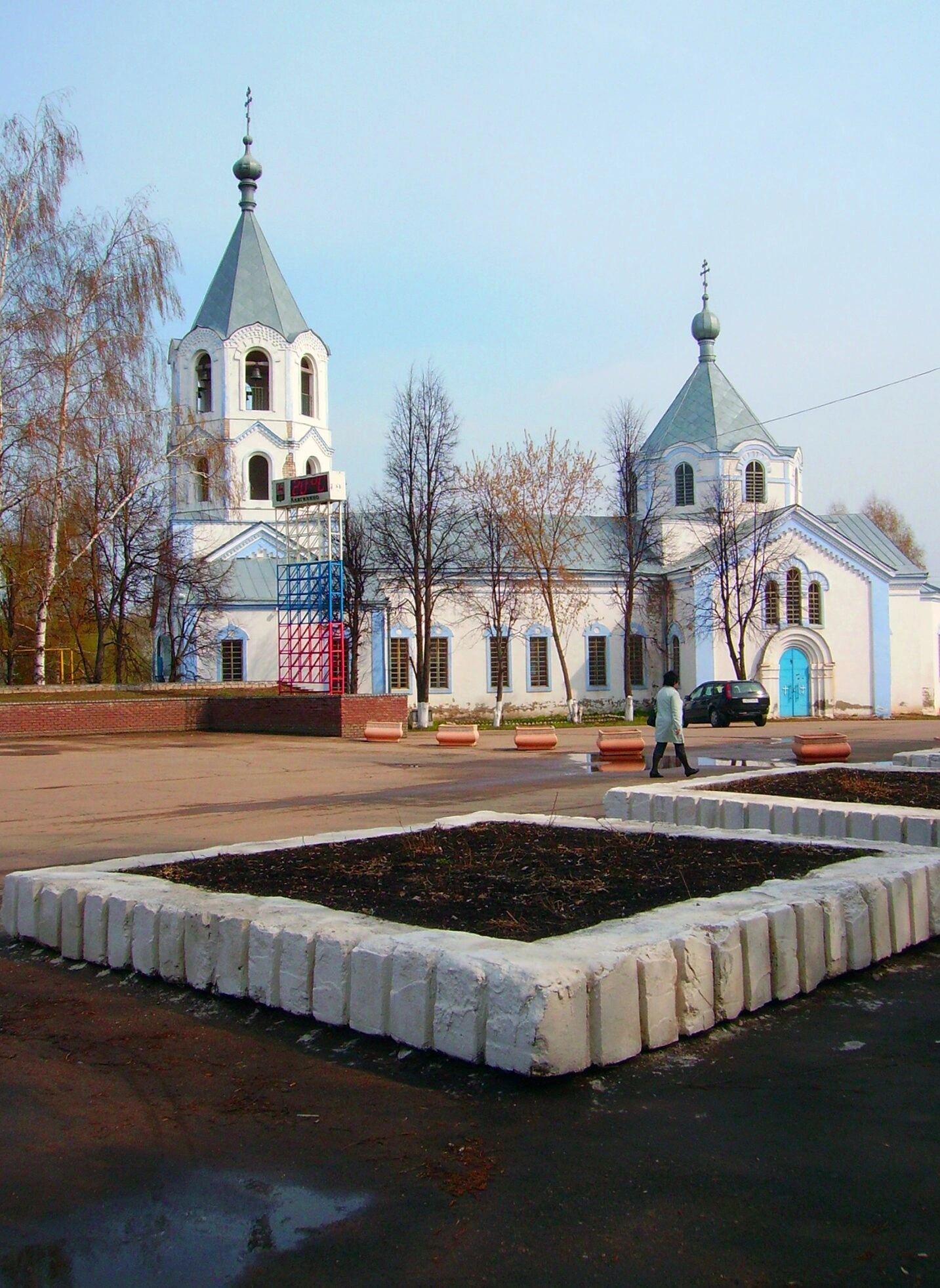 Перед храмом располагается благоустроенная площадь с аккуратными клумбами, что подчёркивает ухоженность и значимость святого места. На снимке виден прихожанин, идущий по площади, что добавляет кадру ощущение живого молитвенного места. Припаркованный автомобиль и деревья без листвы, указывающие на межсезонье, свидетельствуют о современности фотографии и повседневной жизни храма в наши дни.