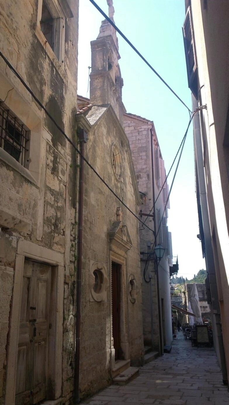 Исторически храм был построен при поддержке сербских купцов, проживавших на острове, а значительные дары для его убранства предоставили Неманичи. В период венецианского владычества церковь была обращена в католический храм, посвящённый Святой Варваре, и лишь в ноябре 1934 года возвращена Сербской православной церкви и торжественно освящена. Снимок передаёт не только архитектурный облик, но и атмосферу тихого улочного пространства, ведущего к этой древней православной святыне.