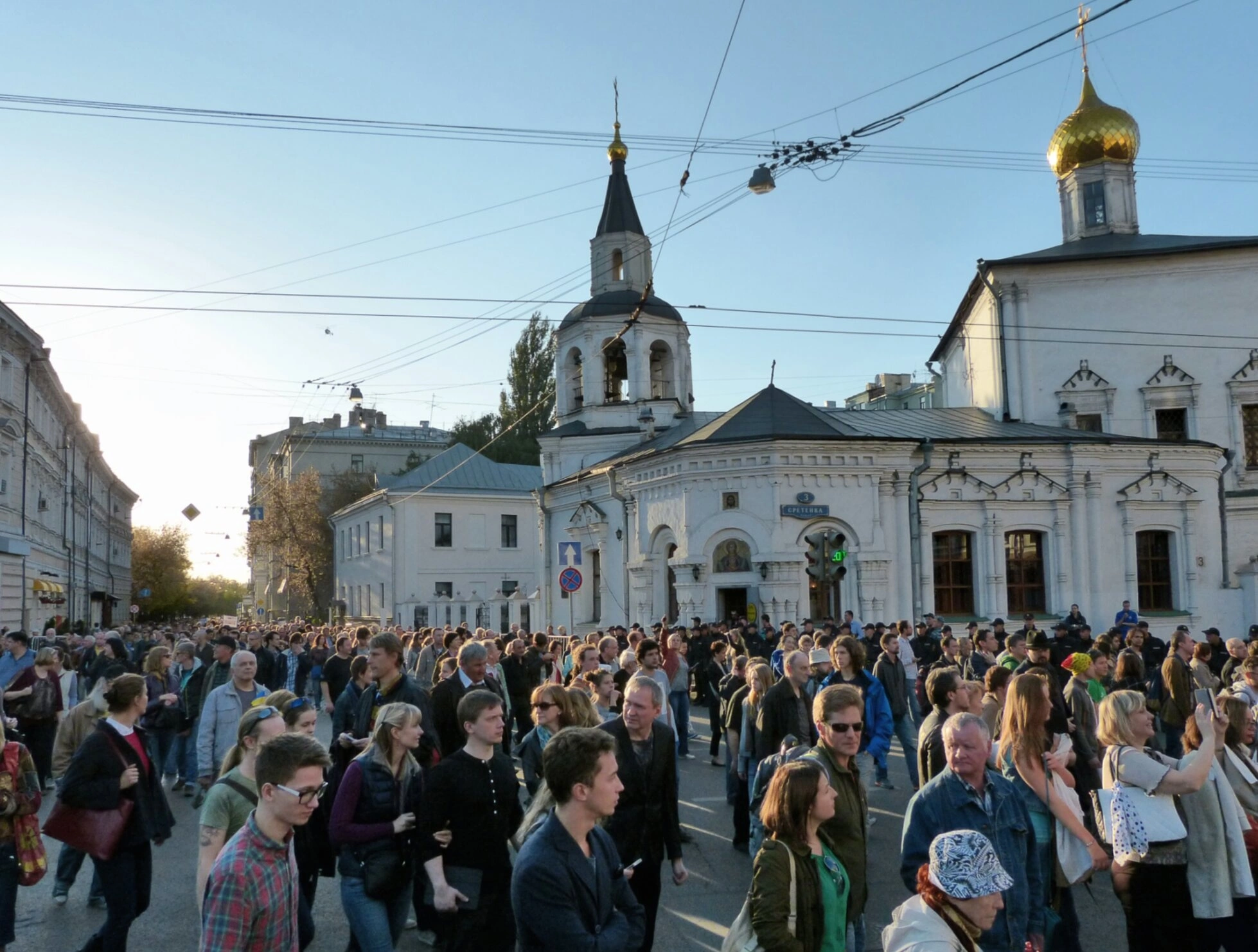 На переднем плане фотографии видна оживлённая улица, заполненная людьми. Это создаёт ощущение живого городского ритма и повседневной жизни, которая течёт вокруг древней святыни. Люди изображены в повседневной одежде, что свидетельствует о кадре, сделанном в обычный день, возможно, после совершения богослужения или во время посещения храма верующими. Деревья на заднем плане и характерные для центра Москвы здания обрамляют храм, подчёркивая его органичную вписанность в историческую городскую среду. Видны также протянутые над улицей провода, что добавляет кадру ощущение подлинности и связи времён.