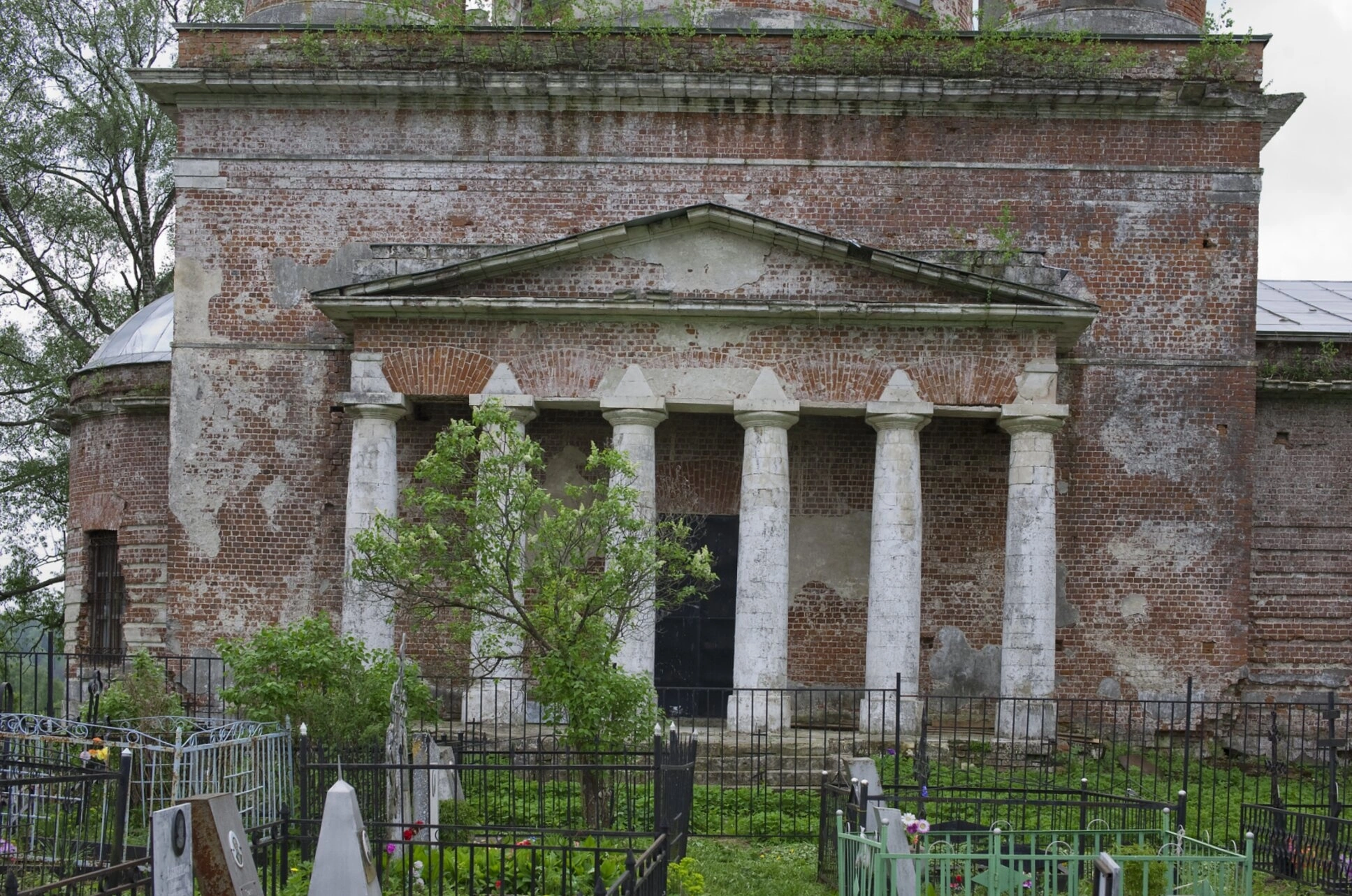 Здание церкви выполнено из красного кирпича и демонстрирует черты архитектурного стиля, характерного для рубежа XIX-XX веков. На снимке хорошо просматривается главный фасад с арочными оконными проёмами, а также массивный купол на высоком барабане, который частично скрыт порослью. Центральный вход акцентирован портиком с колоннами, поддерживающими треугольный фронтон. Состояние здания свидетельствует о длительном отсутствии реставрационных работ: кирпичная кладка местами обветшала, а кровля и купол обильно заросли древесной растительностью, что придаёт храму особый, скорбный вид.