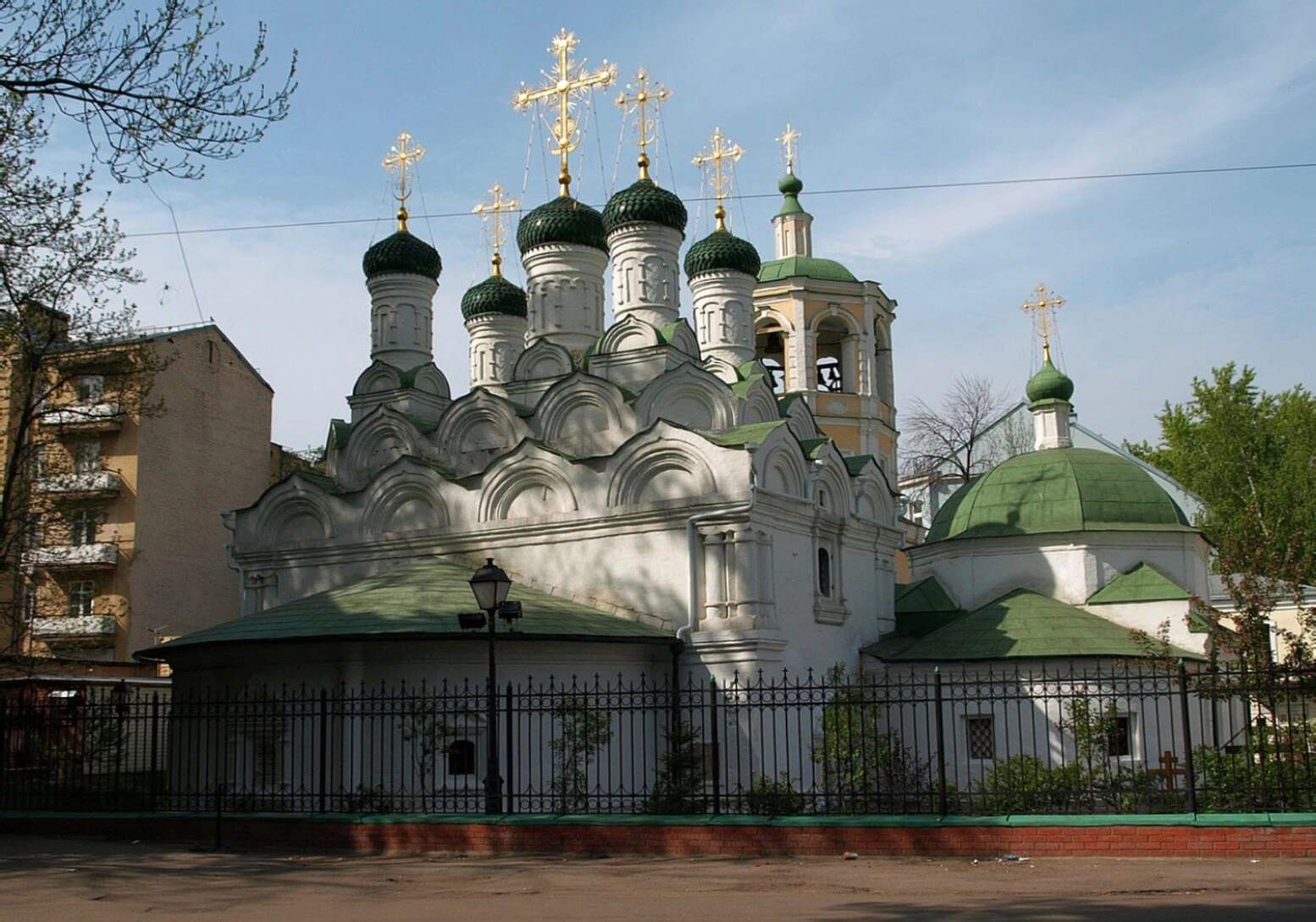 На представленной фотографии запечатлён храм Успения Пресвятой Богородицы в Путинках, являющийся выдающимся памятником русской церковной архитектуры середины XVII века. Этот православный храм, расположенный в самом сердце Москвы, в Успенском переулке Тверского района, по праву считается одним из последних и наиболее ярких образцов шатрового зодчества перед введением запрета на строительство шатровых храмов патриархом Никоном.