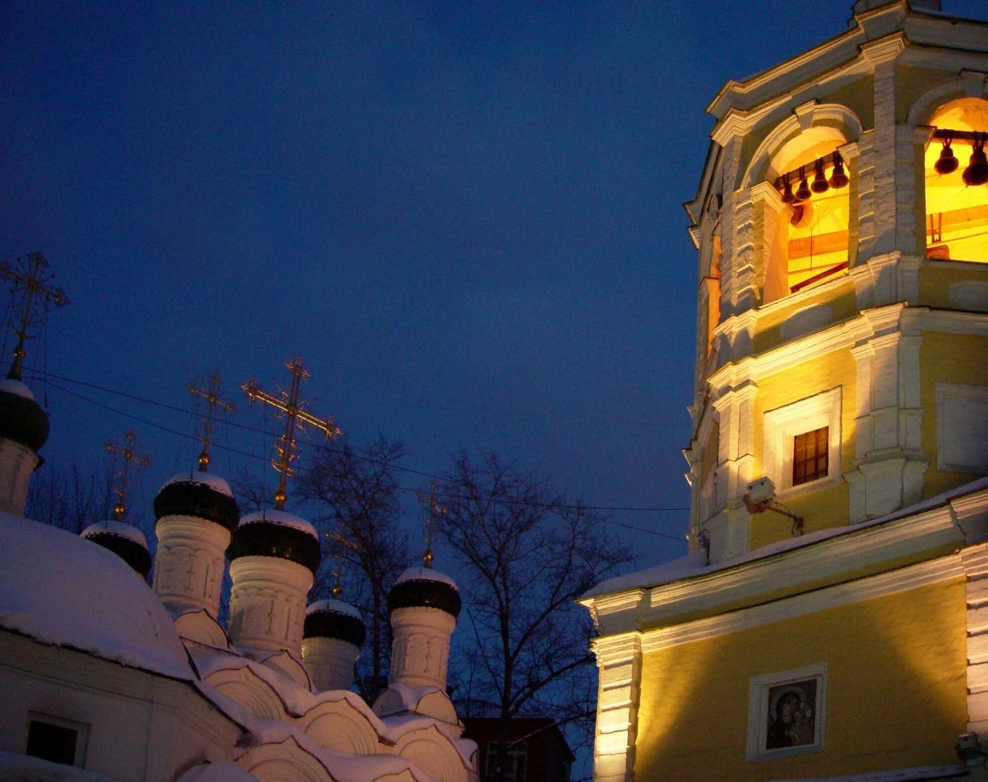 В левой части кадра возносятся к небу несколько заснеженных куполов, увенчанных православными крестами. Снежное покрывало на кровле и главах храма символизирует чистоту и духовное обновление. В правой части снимка dominates стройная колокольня, чьи проемы ярко освещены изнутри — в верхнем ярусе можно различить церковные колокола, предназначенные для созыва верующих на богослужения.