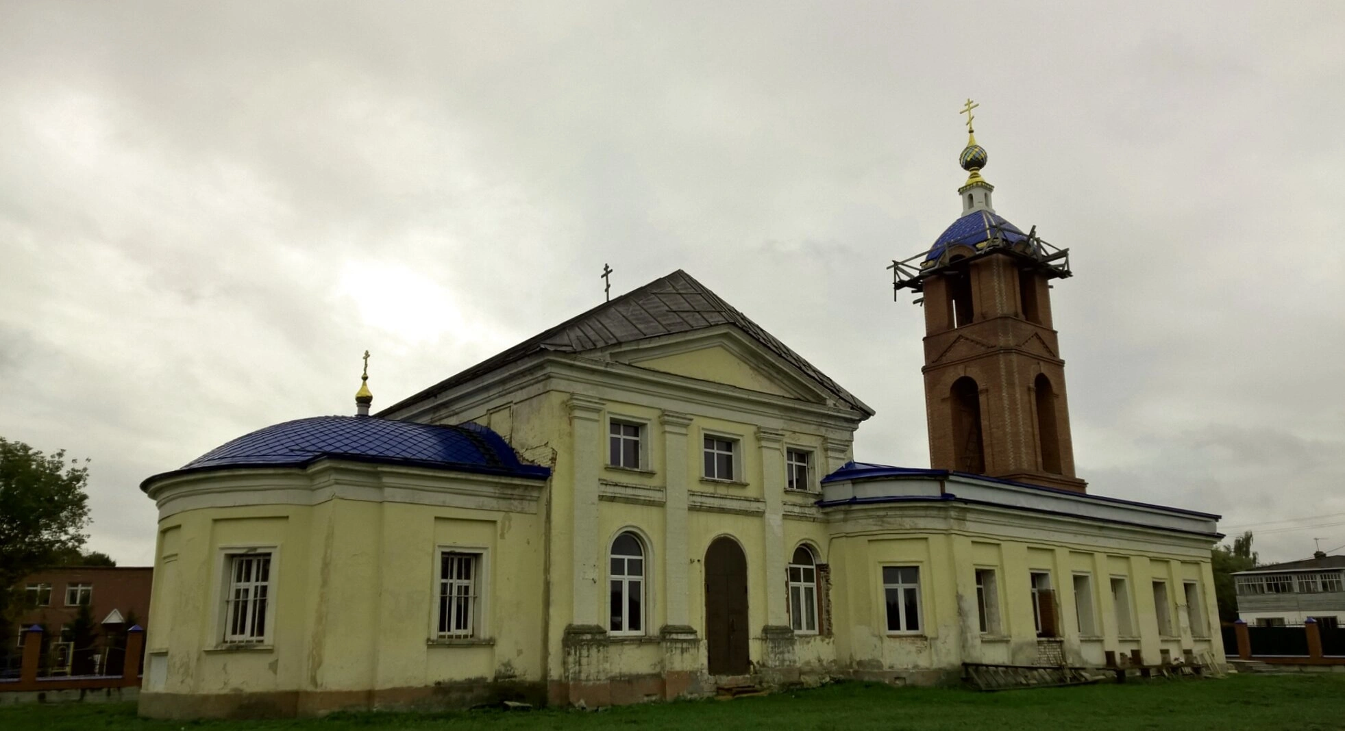 Особое внимание на снимке привлекает высокая многоярусная колокольня, расположенная справа от основного объёма. В момент съёмки верхняя часть колокольни была охвачена строительными лесами, что свидетельствует о проведении активных реставрационных работ по её восстановлению для будущего возрождения колокольного звона. Ярко-синий купол с позолоченным шпилем и крестом над колокольней эффектно выделяется на фоне неба.