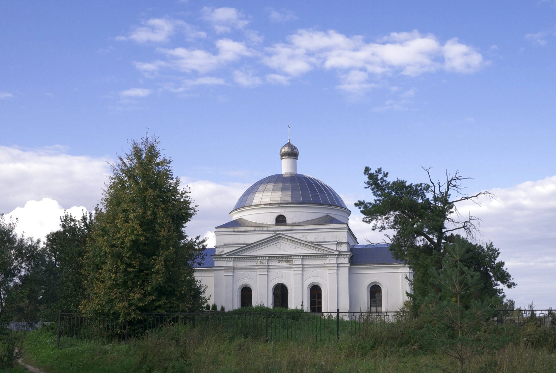 Храм гармонично вписан в окружающий богоспасаемый пейзаж. С обеих сторон его окружают тенистые деревья, а перед фасадом расстилается ухоженный травяной покров, ограждённый скромной оградой. Высокое бездонное небо с плывущими облаками дополняет умиротворяющую картину, наполняя её божественным светом и спокойствием. Этот образ воплощает идею гармонии между творением рук человеческих и нетленной красотой Божьего мира.