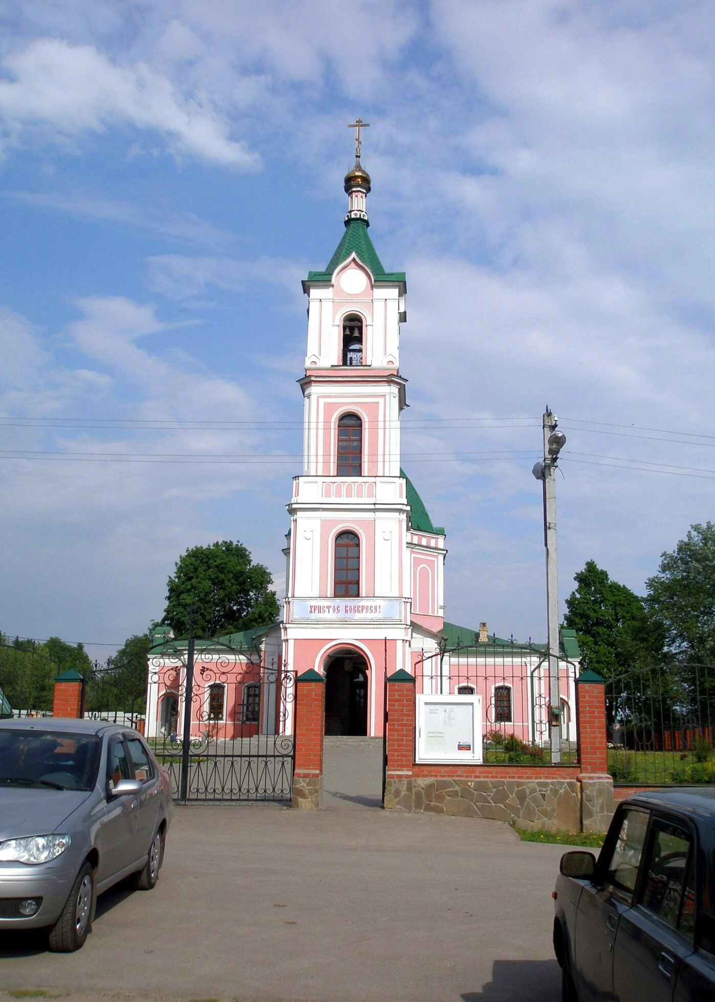 Территория вокруг храма благоустроена, перед входом установлена ограда с воротами. На переднем плане фотографии виднеются припаркованные автомобили прихожан, что свидетельствует о том, что в храме регулярно совершаются богослужения. Живописный вид дополняют окружающие храм деревья и кустарники, а на заднем плане открывается ясное голубое небо с лёгкими белыми облаками. Справа от входа расположен информационный стенд для паломников и жителей.
