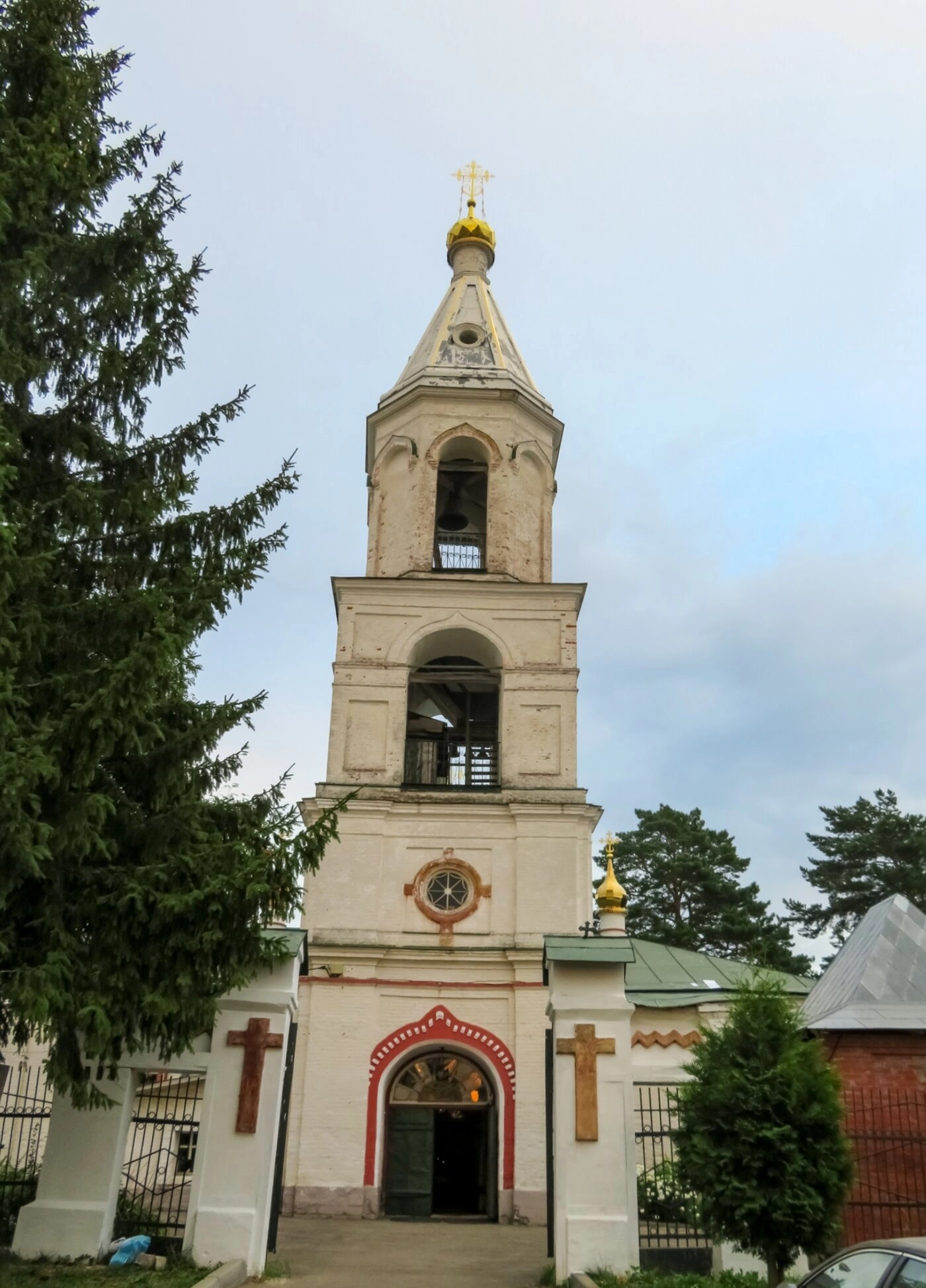 На фотографии запечатлена колокольня и входная группа с воротами храма Успения Пресвятой Богородицы, что расположен в селе Старые Кузьмёнки Московской области. Белоснежная трёхъярусная колокольня, увенчанная золочёным куполом и сияющим крестом, является архитектурной доминантой ансамбля. Её стройный силуэт гармонично сочетается с окружающим природным ландшафтом, где среди хвойных и лиственных деревьев возвышается дом молитвы.