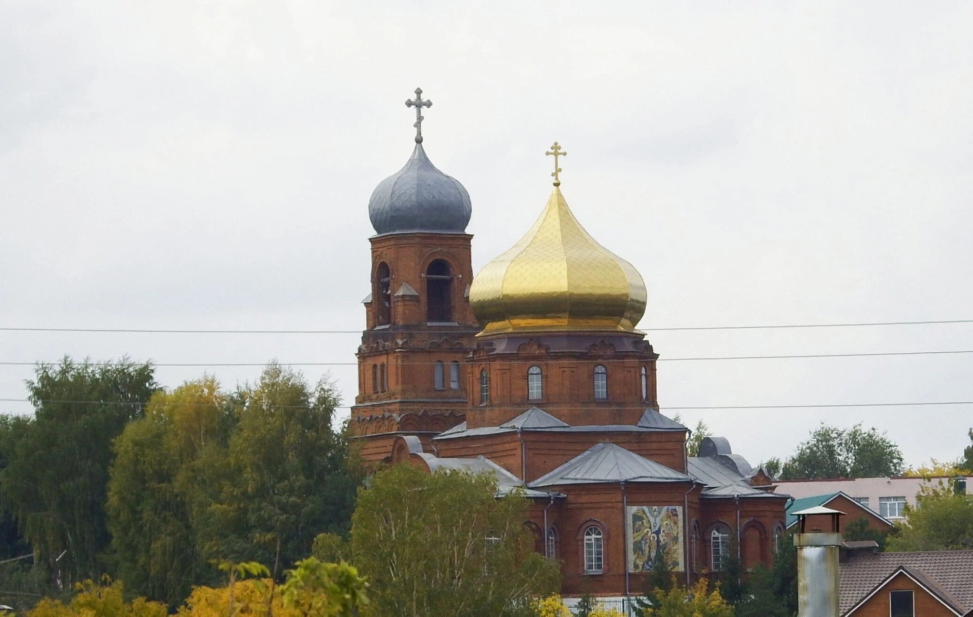 На снимке храм изображён в окружении осенней природы. Деревья с жёлтой листвой обрамляют церковный двор, создавая ощущение уюта и покоя. На заднем плане виднеются элементы сельской застройки и пасмурное небо, что подчёркивает величие и духовную твердыню православной святыни в самом сердце российской глубинки. Данный храм является не только архитектурным достоянием, но и действующим духовным центром, привлекающим паломников и верующих.