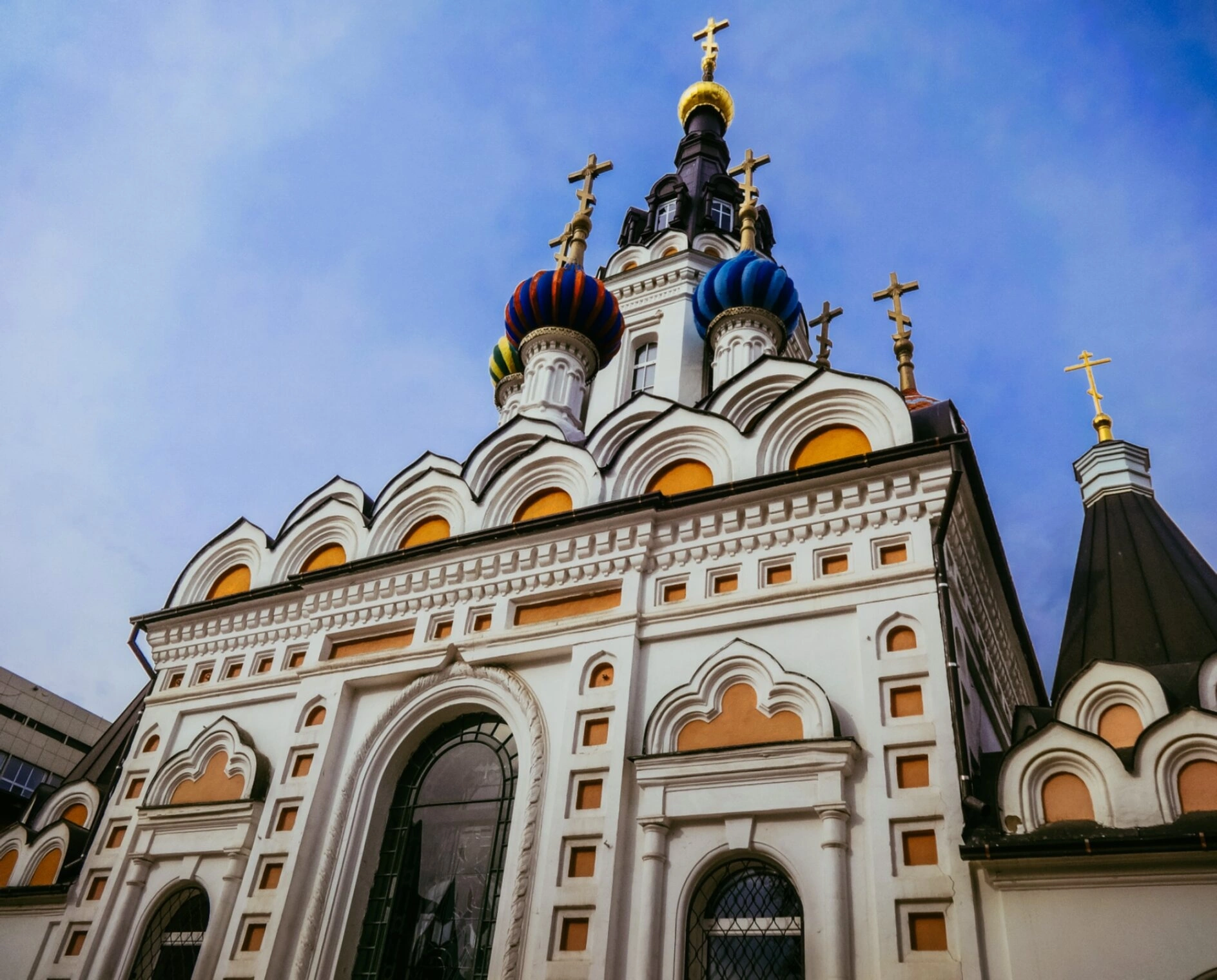 На представленной фотографии запечатлён храм в честь чудотворной иконы Божией Матери «Утоли моя печали», расположенный в городе Саратове. Этот православный храм, освящённый в 1906 году, является выдающимся памятником церковной архитектуры начала XX века и имеет особое значение для духовной жизни города.