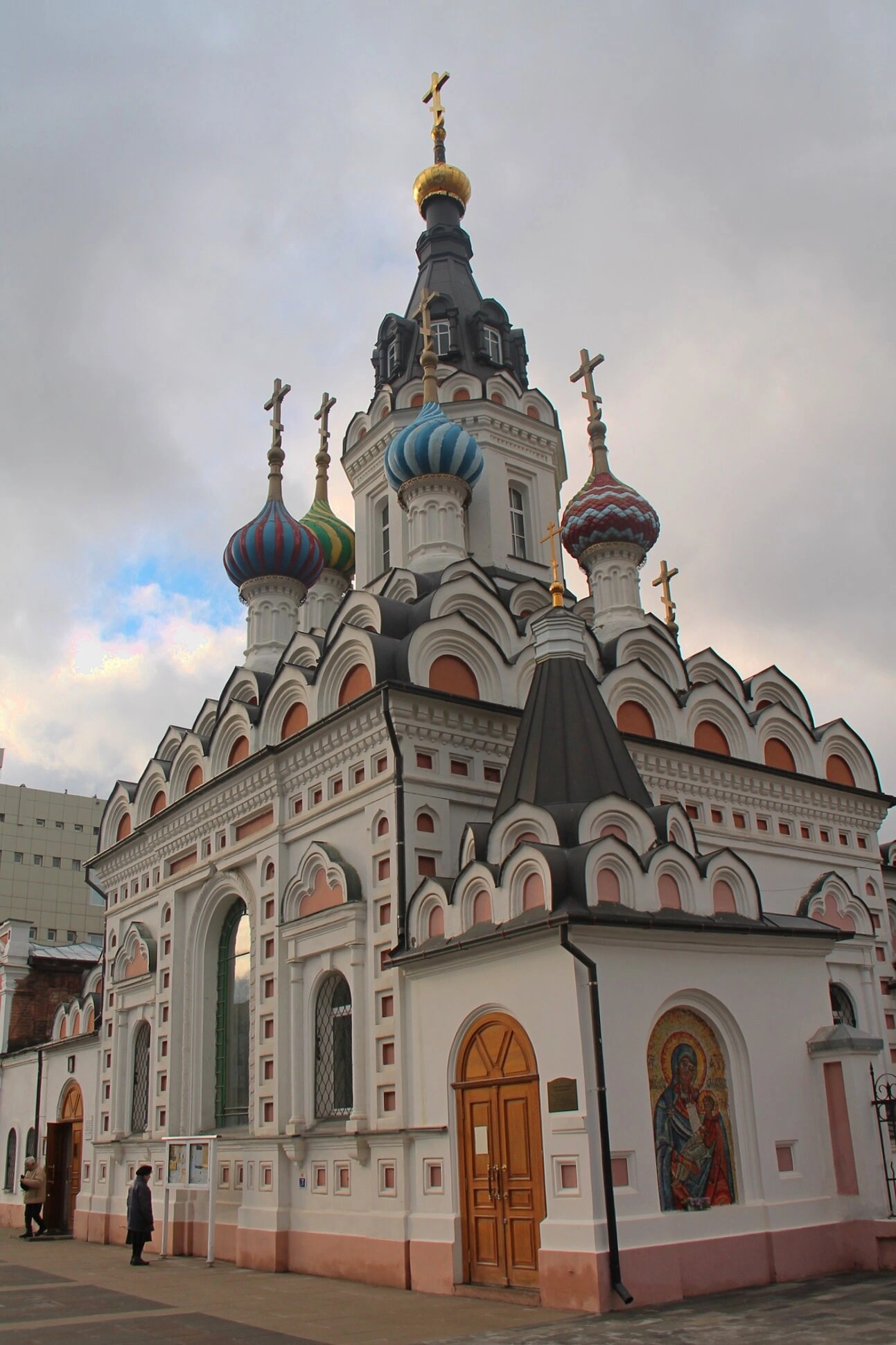 На фотографии запечатлён храм в честь чудотворной иконы Божией Матери «Утоли моя печали», расположенный в городе Саратове на территории архиерейского подворья. Этот православный храм является значимым духовным центром и архитектурным украшением города.
